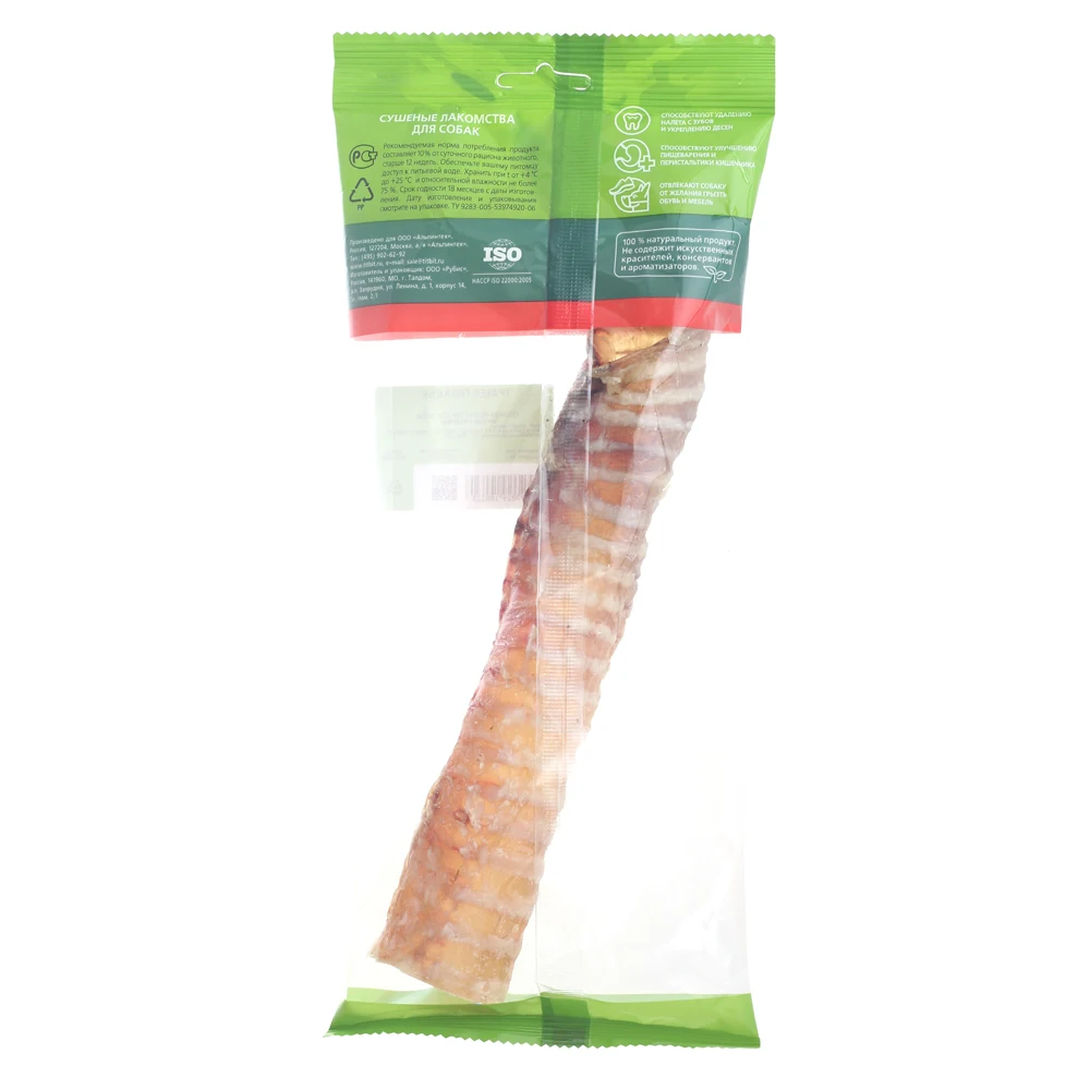 Упаковка содержит 1 отрезок трахеи длиной 24-26 см. Низкокалорийное, богатое хрящевой и соединительной тканью лакомство. Улучшает состояние кожи и шерсти. Великолепно скрасит досуг собак преклонного возраста, а также собак с неполной зубной формулой.