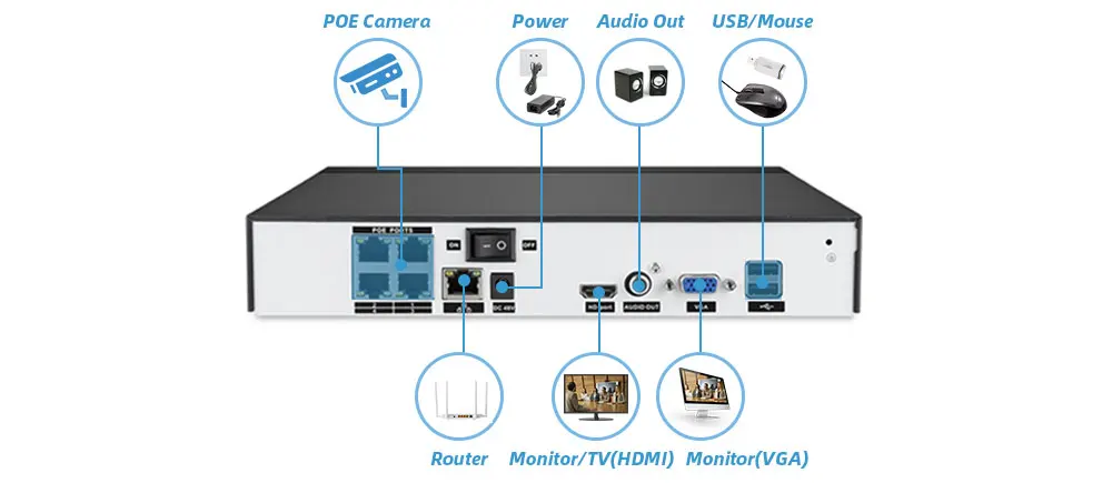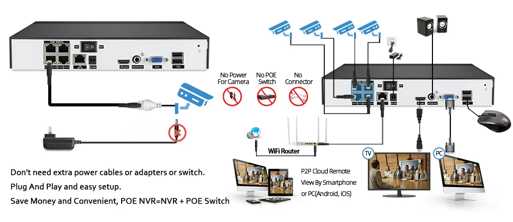 Нет дополнительных кабелей питания или адаптеров, просто подключив ip-камеру к NVR с помощью одного кабеля, вы можете легко завершить установку без знания о компьютере или сети и начать наслаждаться супер простым мониторингом среди вашего смартфона, планшета или ПК.Экономьте деньги и удобный POE NVR = NVR + POE коммутатор, подключи и работай и простая настройка!