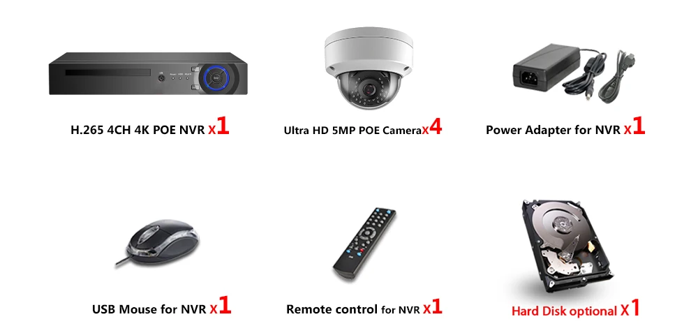 1 сетевой видеорегистратор 4CH 4K POE NVR;4 X HD POE IP 5.0MP Крытый Открытый ИК День ночного видения атмосферостойкие камеры;1 X Блок питания для NVR;1 х USB мышь для NVR;1 компакт-диск программного обеспечения для NVR;1 пульт дистанционного управления для NVR;Жесткий диск опционально!