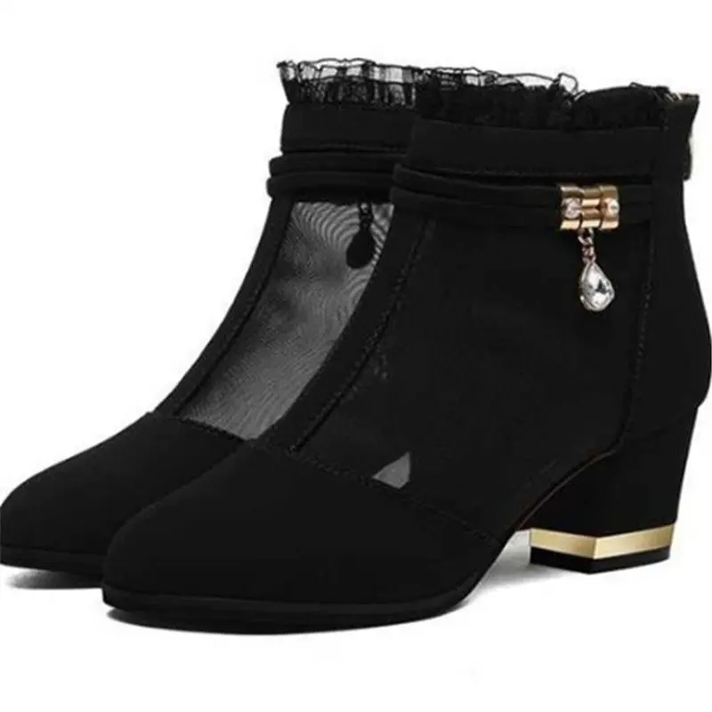 Босоножки женские в сеточку, полусапожки на высоком каблуке, 2020 г., Новая женская летняя обувь на каблуке, женская модная черная обувь с острым носком