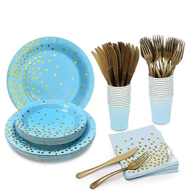 Синий золотой вечерние набор одноразовой посуды бумажные стаканчики и тарелки соломинки подставка для свадебного торта украшение стола одежда для свадьбы, дня рождения вечерние поставки