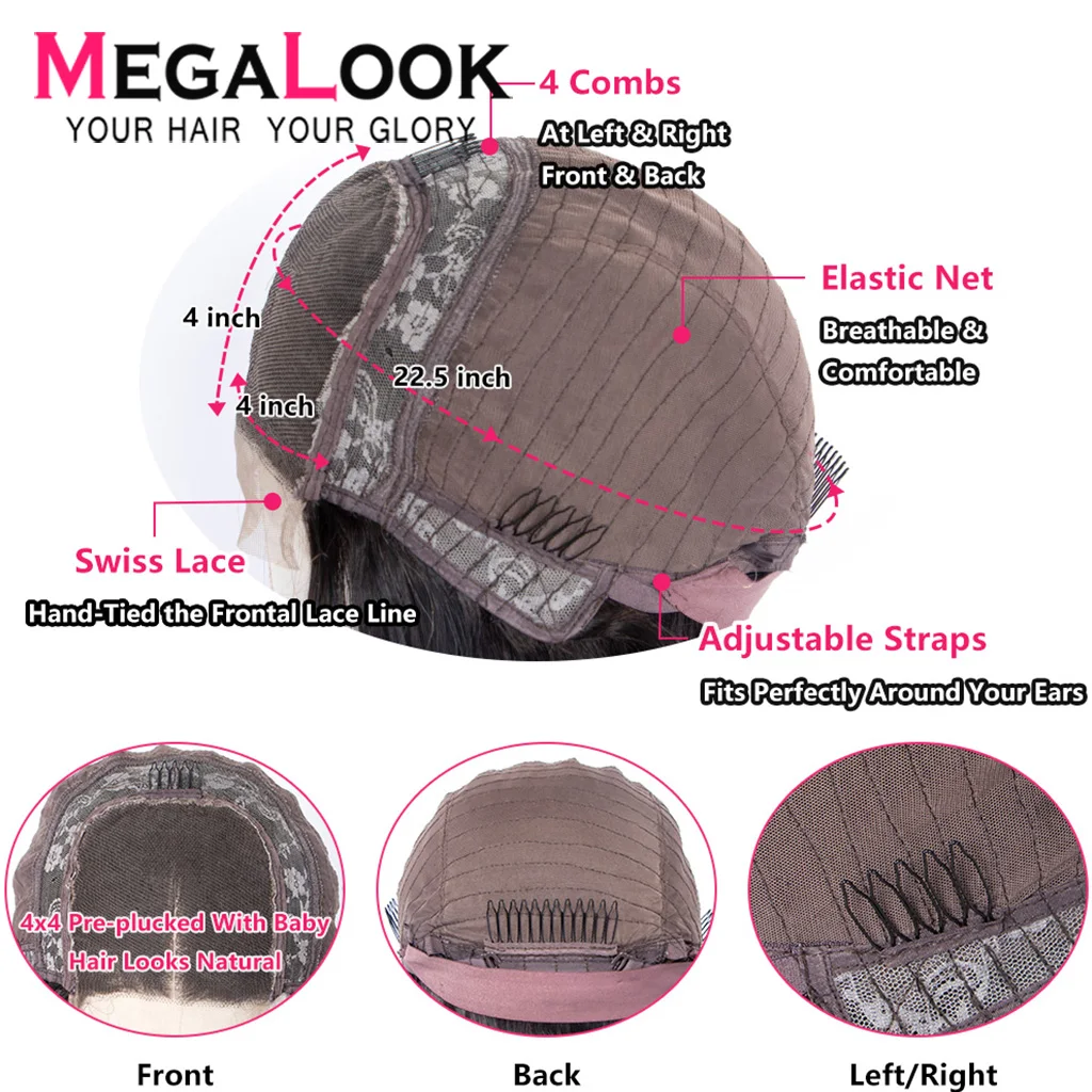 Парики с застежкой 4x4 на сетке Megalook Remy 30 дюймов, бразильски...