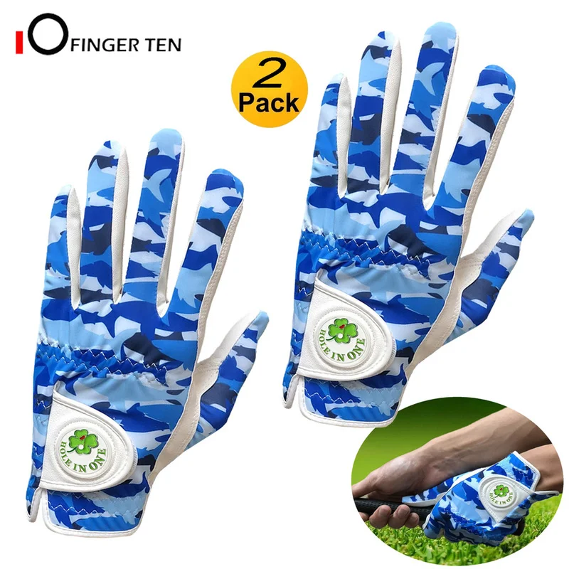 2 шт., мужские перчатки для гольфа с шариковым маркером, мягкая кожа, синяя камуфляжная, левая и правая, дышащая, дождевая ручка