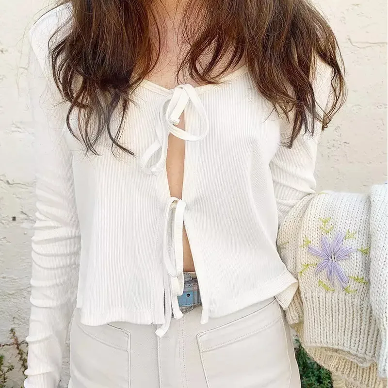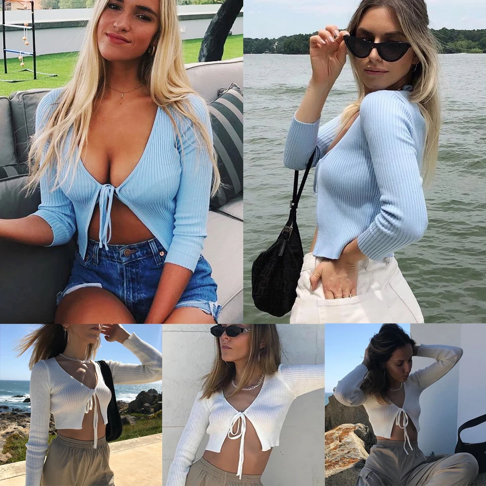 Лидер продаж 2021, женское болеро с узлом спереди, укороченный топ с длинными рукавами, вязаный свитер, кардиган, мягкий вязаный свитер, топы
