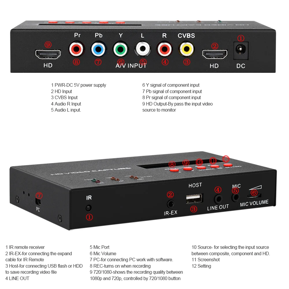 * С кнопкой источника видео и кнопкой выбора качества записи 720p / 1080p. Получите запись/стоп. Выбор источника видео, выбор 720p/1080p и функции съемки с помощью пульта дистанционного управления.