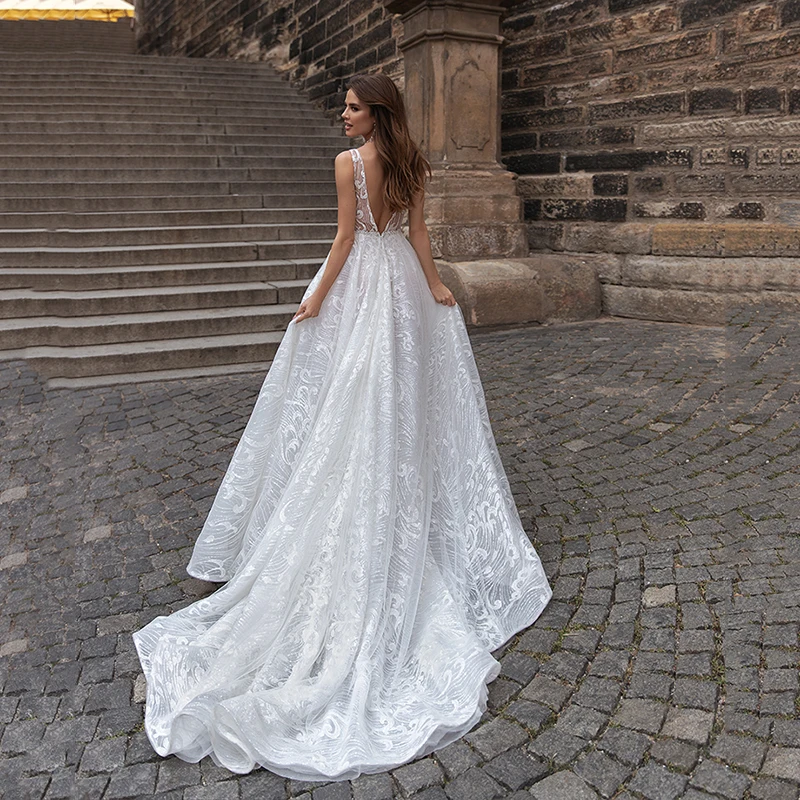 Платье свадебное с V-образным вырезом, открытой спиной и блестками