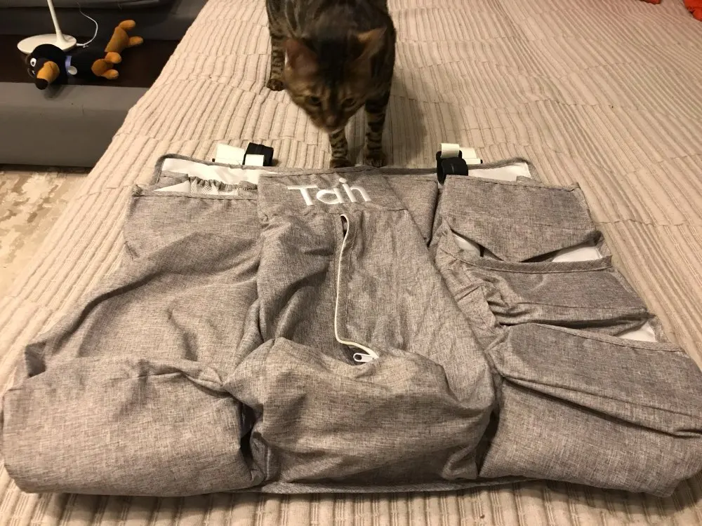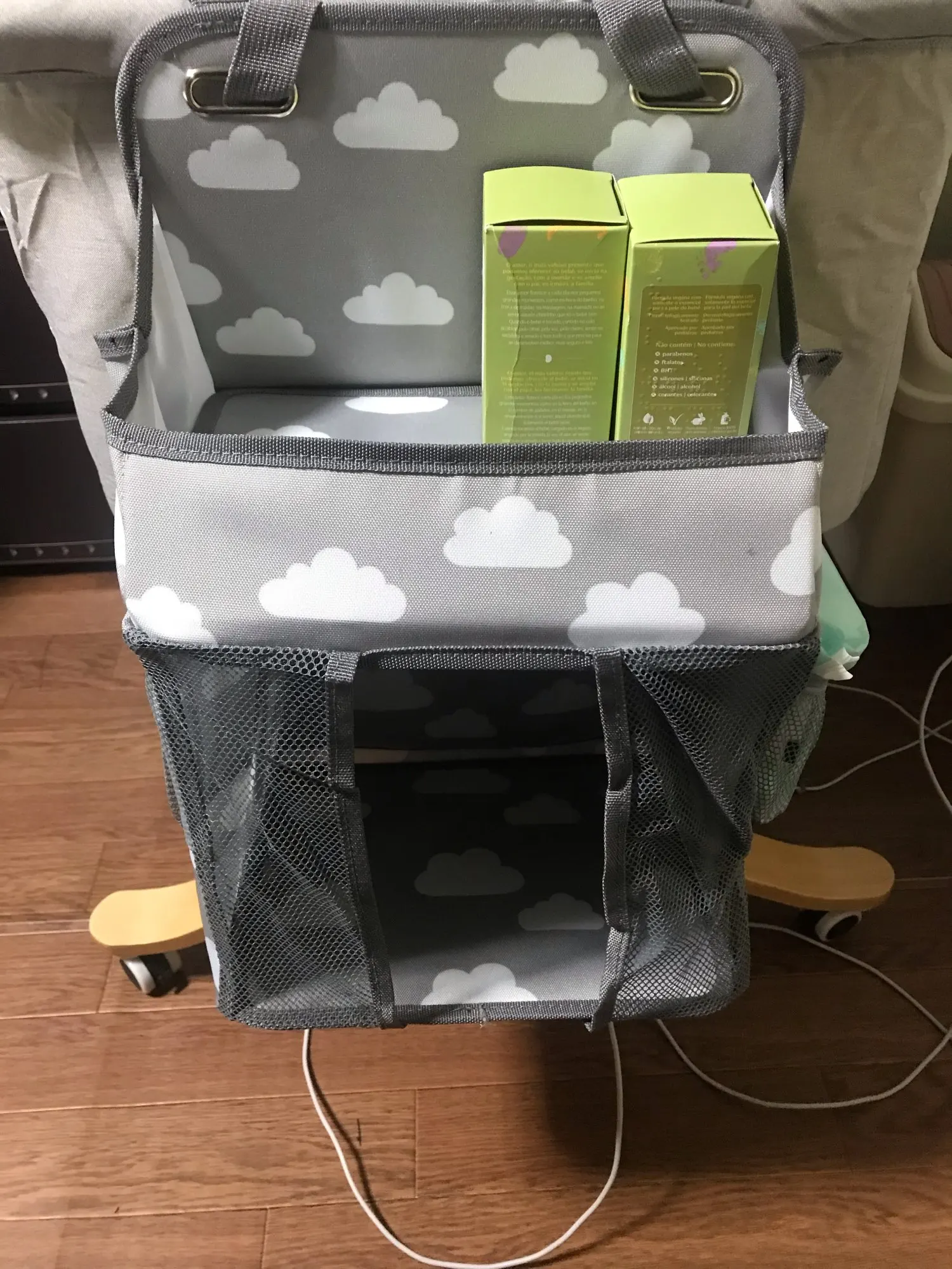 удобный органайзер. по цепили на столик теперь сбоку все под рукой не думаешь над свободным местом и не боишься ничего смахнуть. порадовало что все панели жёсткости не картон а пластик и они вынимаются, что позволило постирать органайзер в машинке перед использованием без последствий