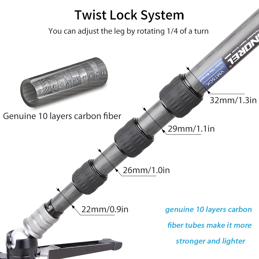Материал: алюминиевый сплав (корпус) углеродное волокно (трубы)Монтажная Платформа: 1/4 ", запасной 3/8" винтСекции: 4Макс. Высота: 1820 ммМин. Высота: 720 ммМаксимальная нагрузка: 10 кгВес: 2,7 кгДиапазон наклона: от-70 до + 90 °Диапазон панорамирования: 360 °Диаметр трубки: 33 мм/29 мм/26 мм/22 мм