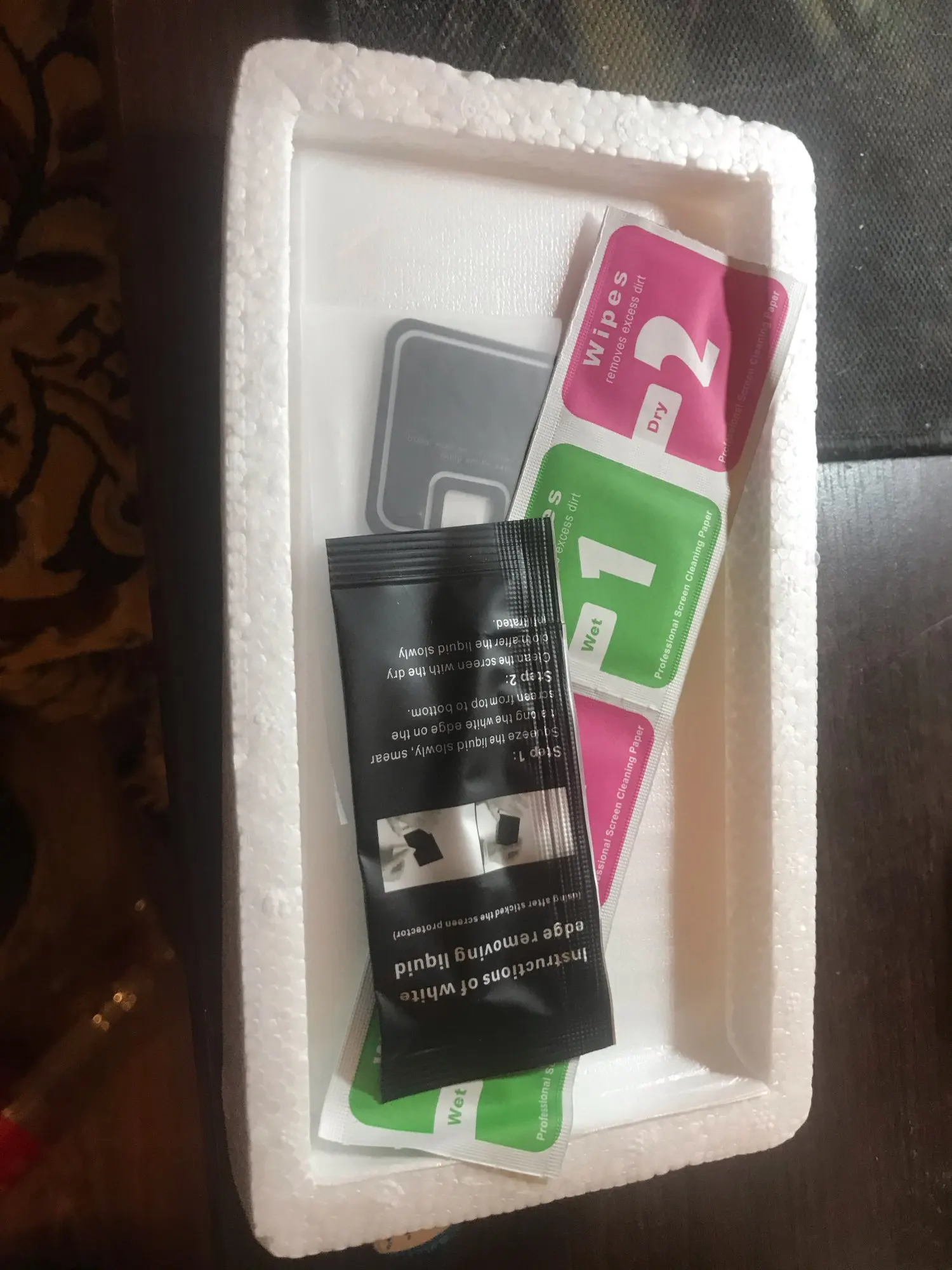 очень хорошее стёклышко. в комплекте салфеточки для обрабатывания поверхности и капсула с жидкостью для заполнения воздушных проёмов. упаковано в пенопласт.дошло относительно быстро