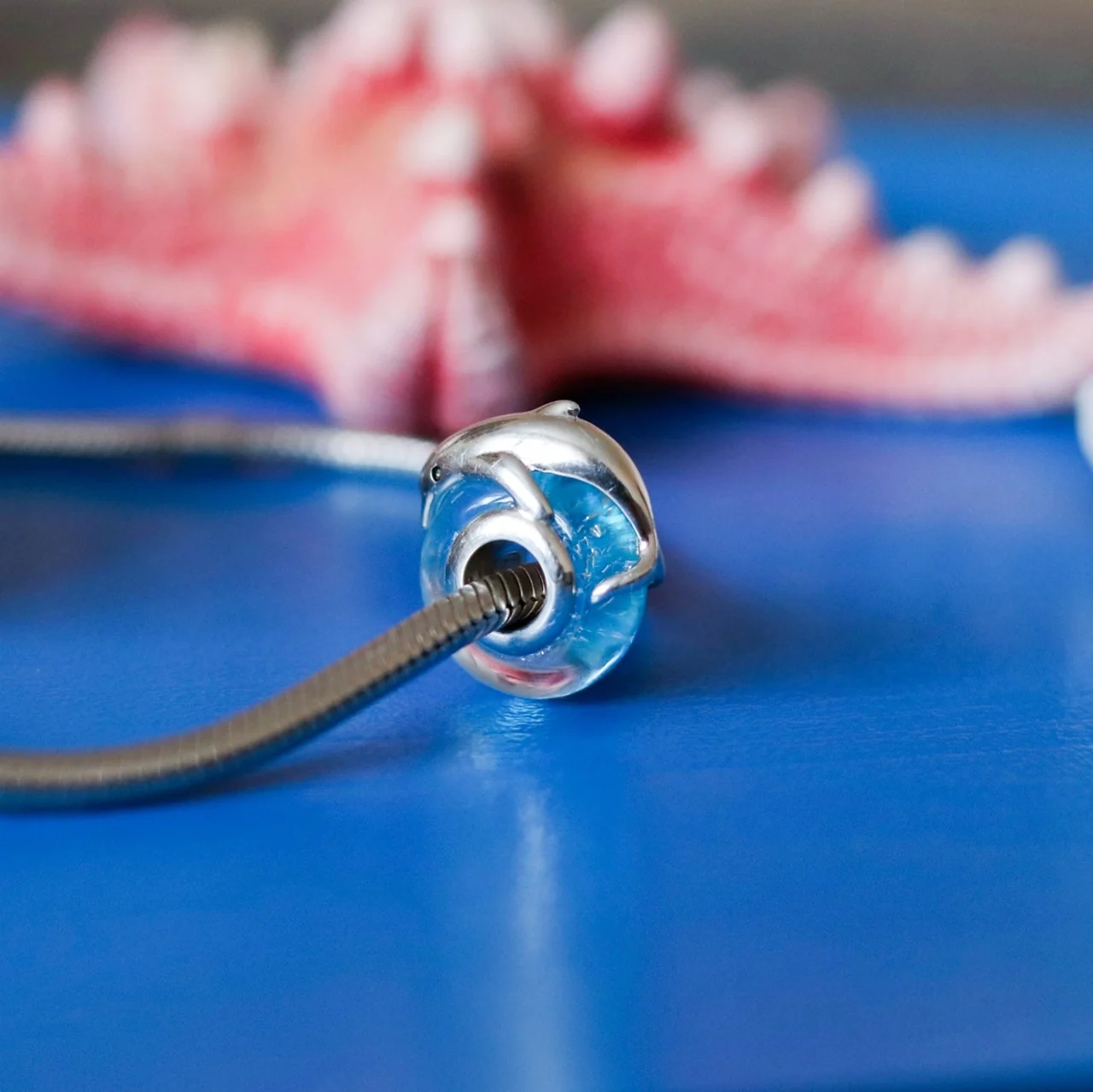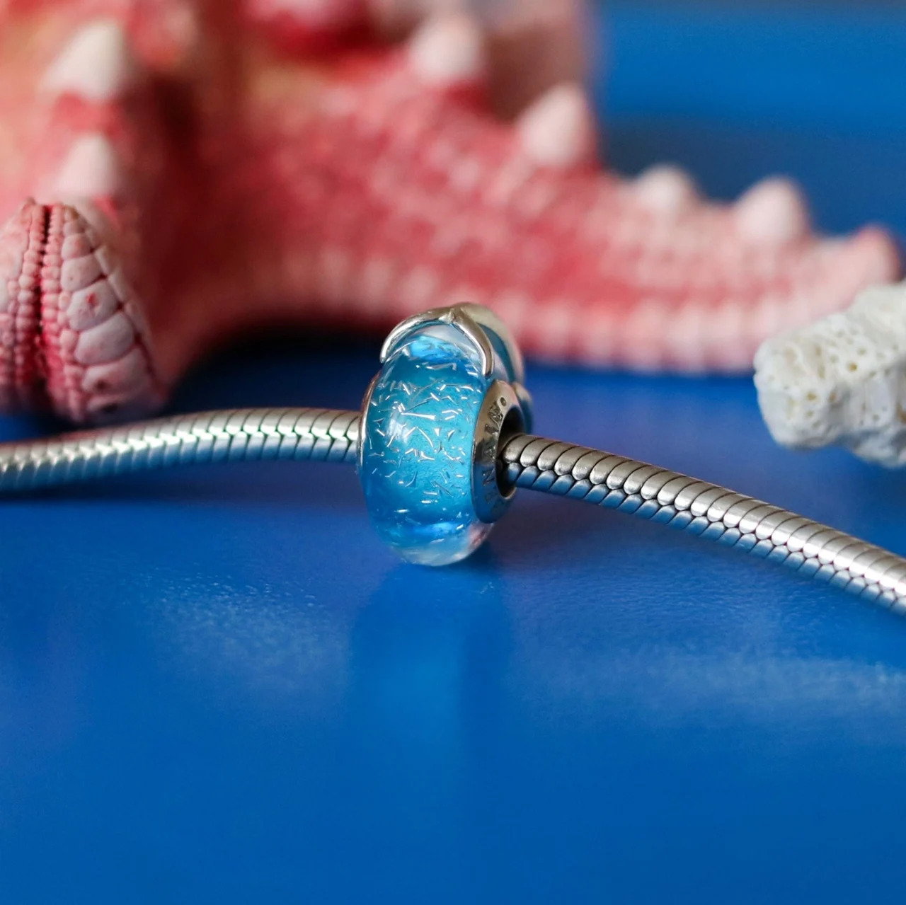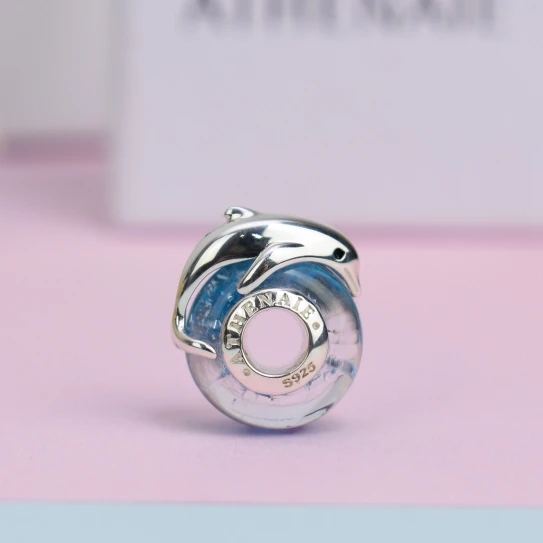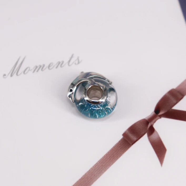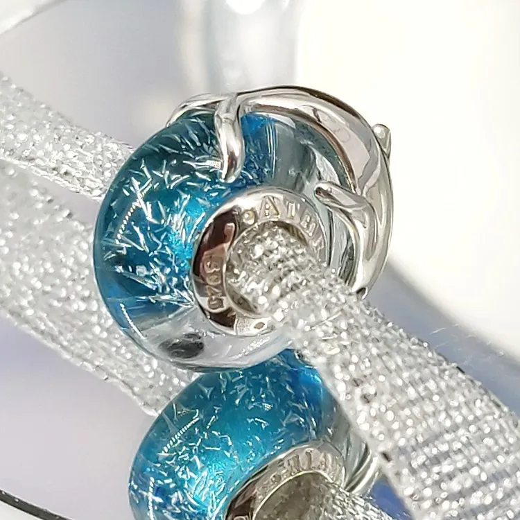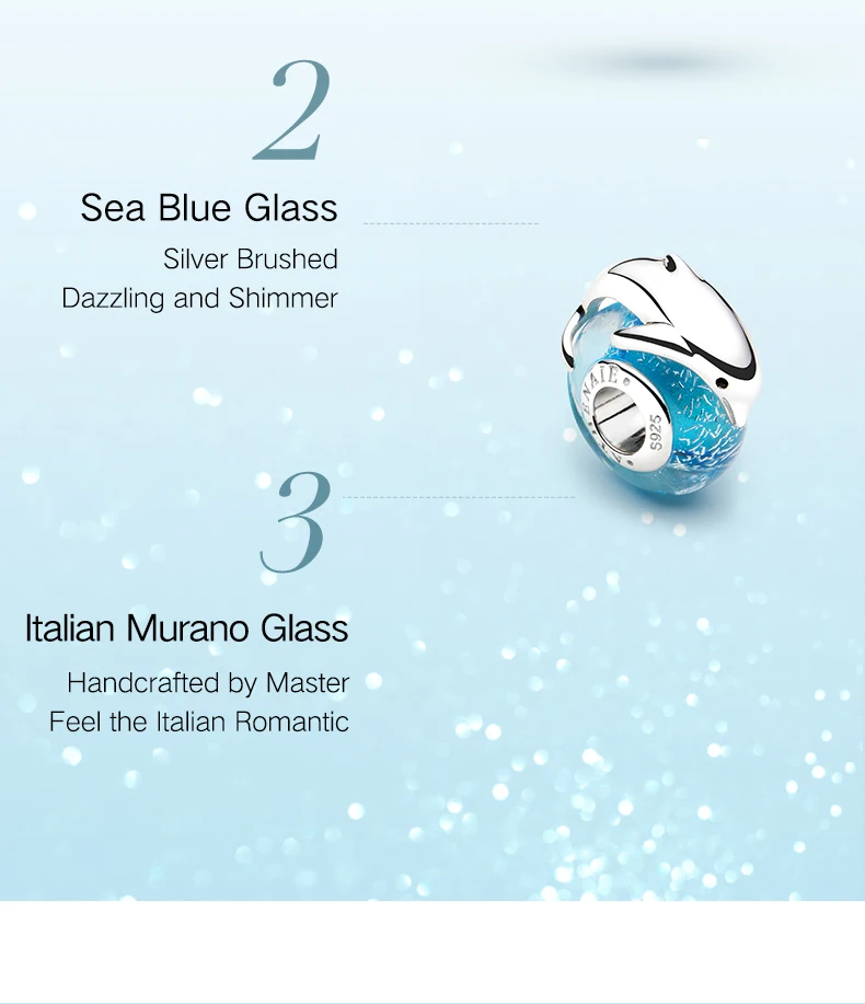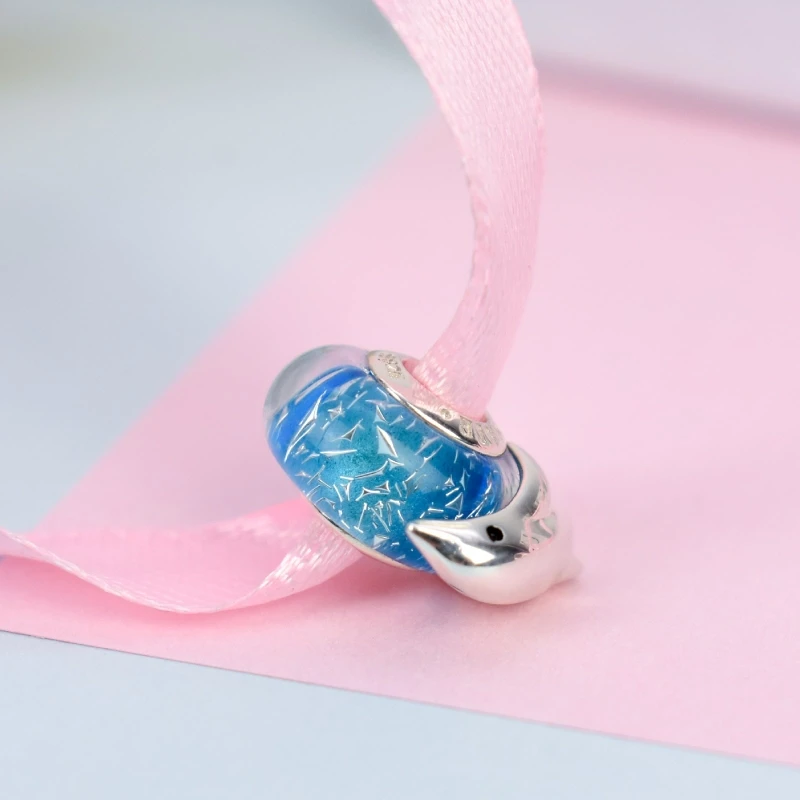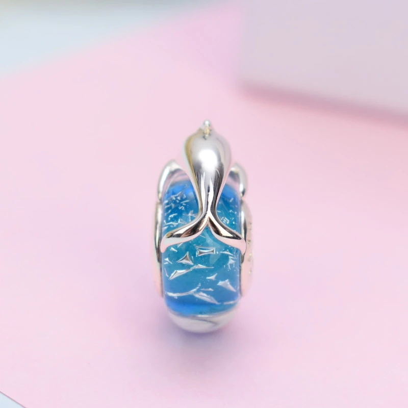 Изготовлен из серебра из муранского стекла. Стекло бирюзового цвета с красивыми серебристыми вкраплениями. Сверху прикреплён симпатичный дельфин. На изделии стоит проба- 925 и название бренда. Качество шарма идеальное. Стекло сияющее, без помутнений. Детали идеально отполированы. Шарм можно носить на цепочке как кулон, так и на браслете. Кстати шарм отлично подходит на браслет Пандора.