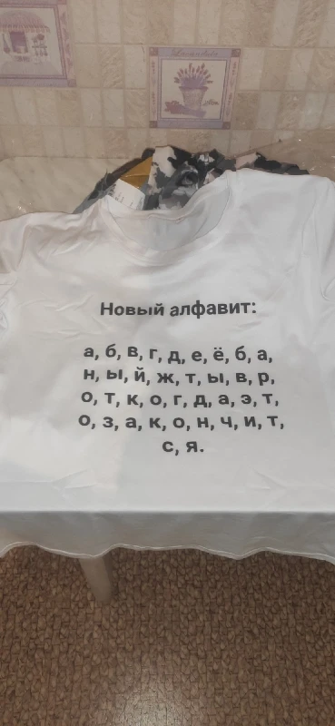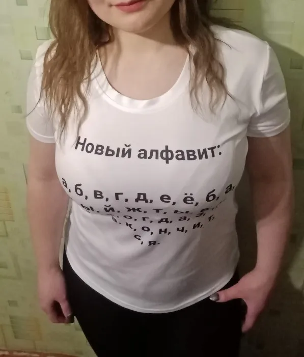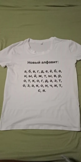 Заказываю уже второй раз. Первая была синяя и больше размером, алфавит был нанесён как термоаппликация, а на этой футболке (белая М-ка) все как надо, шрифт впечатан в ткань. Не знаю с чем это связано, но подруга довольна (для неё заказывала). Размер соответствует, качество на уровне.
