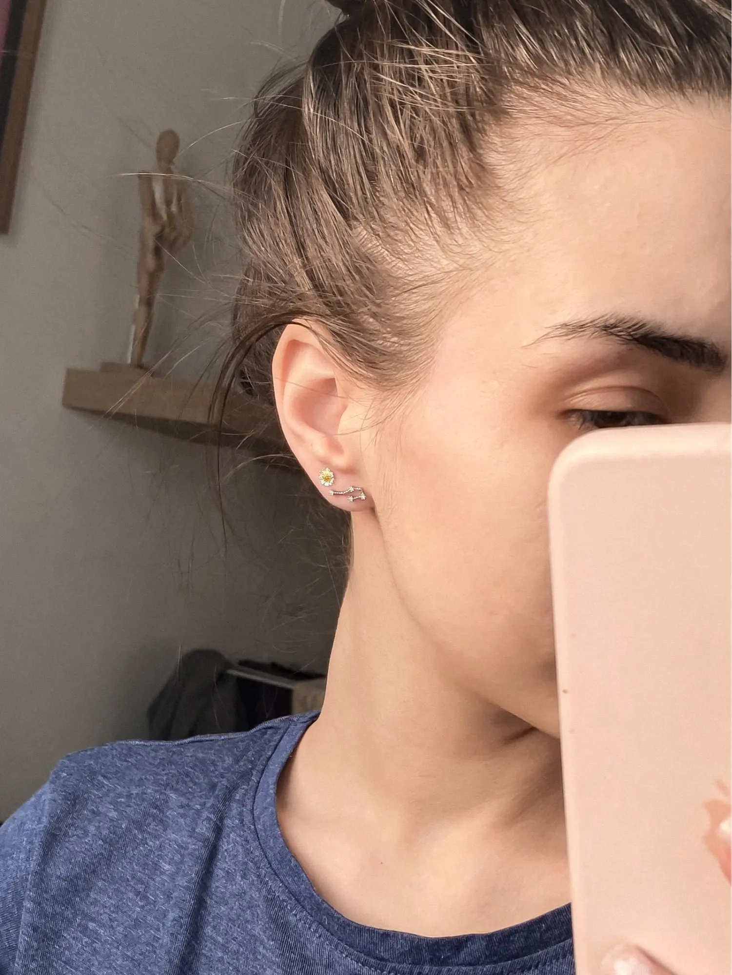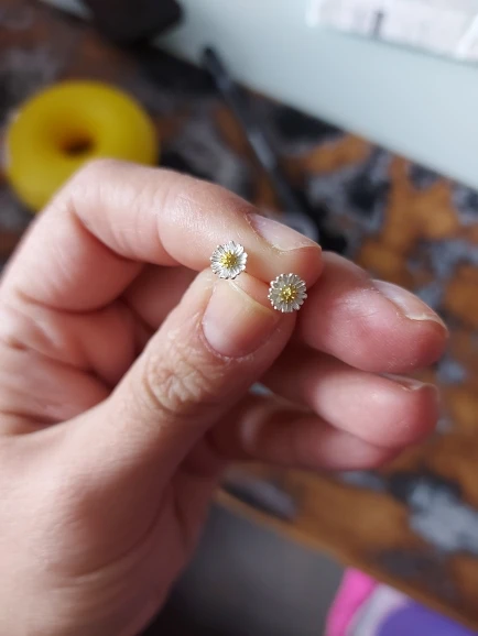 Заказывала 6 мм, уж очень маленькие. Наверное, ромашка лучше смотрится в размере 8 мм. Фиксатор силиконовый. А вообще спасибо продавцу: сережки в коробочке пластиковой, вложена спецтряпочка для ухода за изделием.