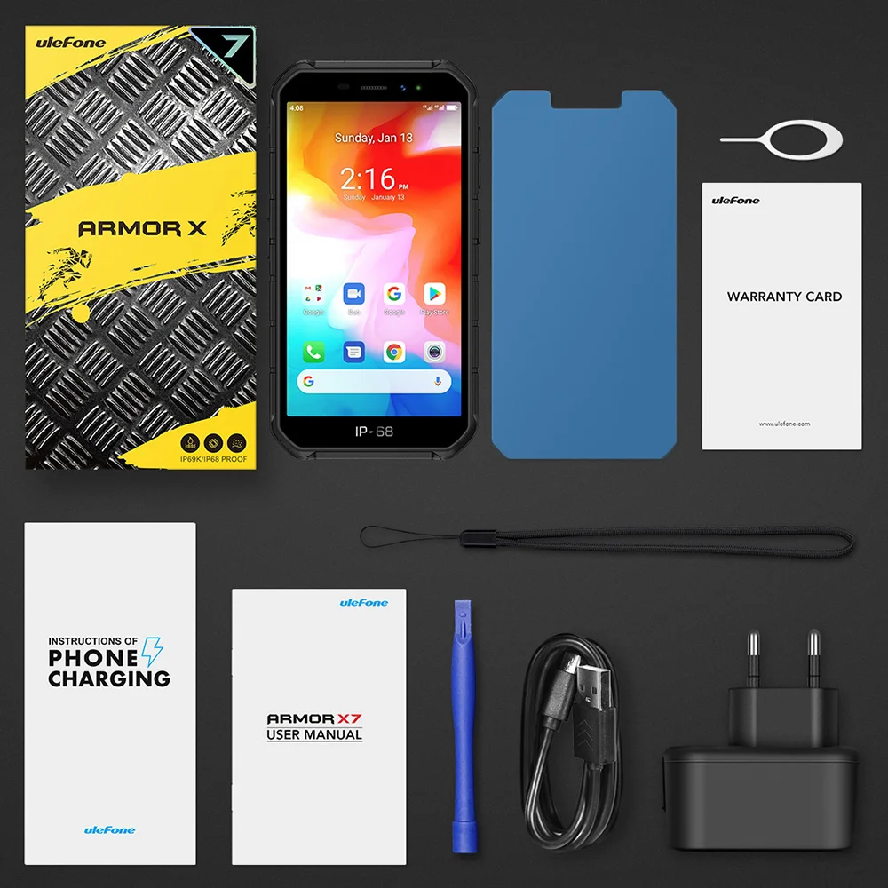1 x Armor X7 Phone (батарея входит в комплект) 1 x Зарядное устройство переменного тока (100 ~ 240 В/штепсельная вилка европейского стандарта) 1 x Кабель для передачи данных (100 см) защитная пленка-1 шт. слинг-1 шт. пластмассовая лопатка-1 шт. игла-SIM-1 шт. гарантийный талон-1 шт. многоязычное Руководство пользователя-1 шт.