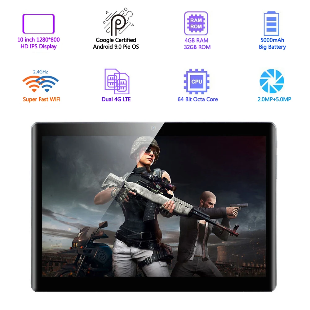 Восьмиядерный процессор+4GB RAM 32GB ROM+Новая система Android 9,0 Pie+Сеть Wi-Fi 4G LTE+10-дюймовый экран 1280*800 IPS+ Порт USB Type C