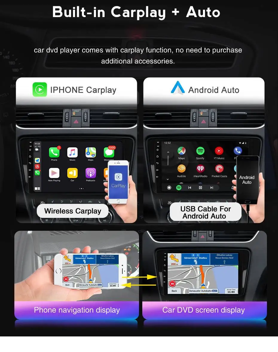 Поддержка задней камеры/DVR/OBD/давление в шинах (опционально), 2 Гб + 32 ГБ встроен в Carplay, DAB + (опционально)