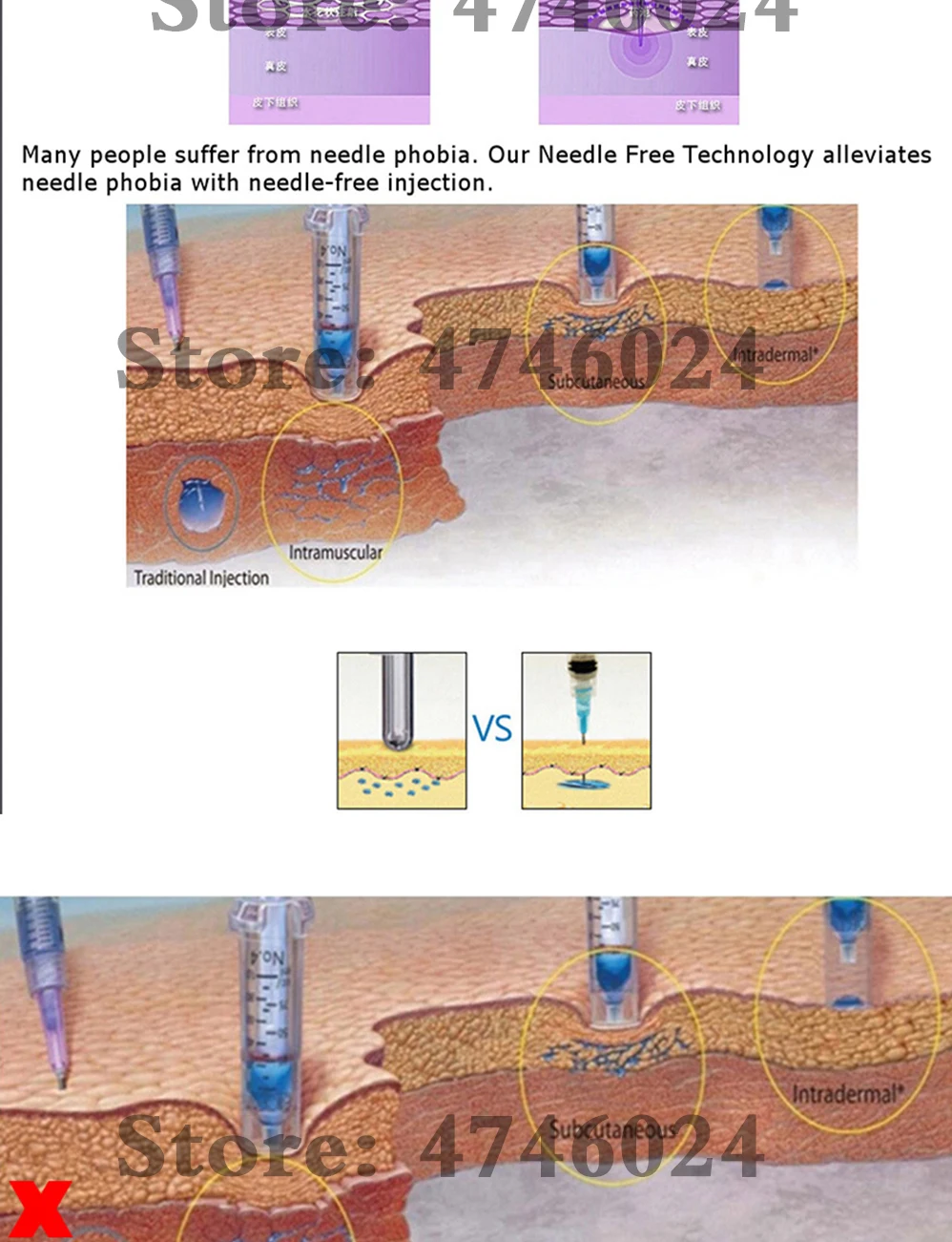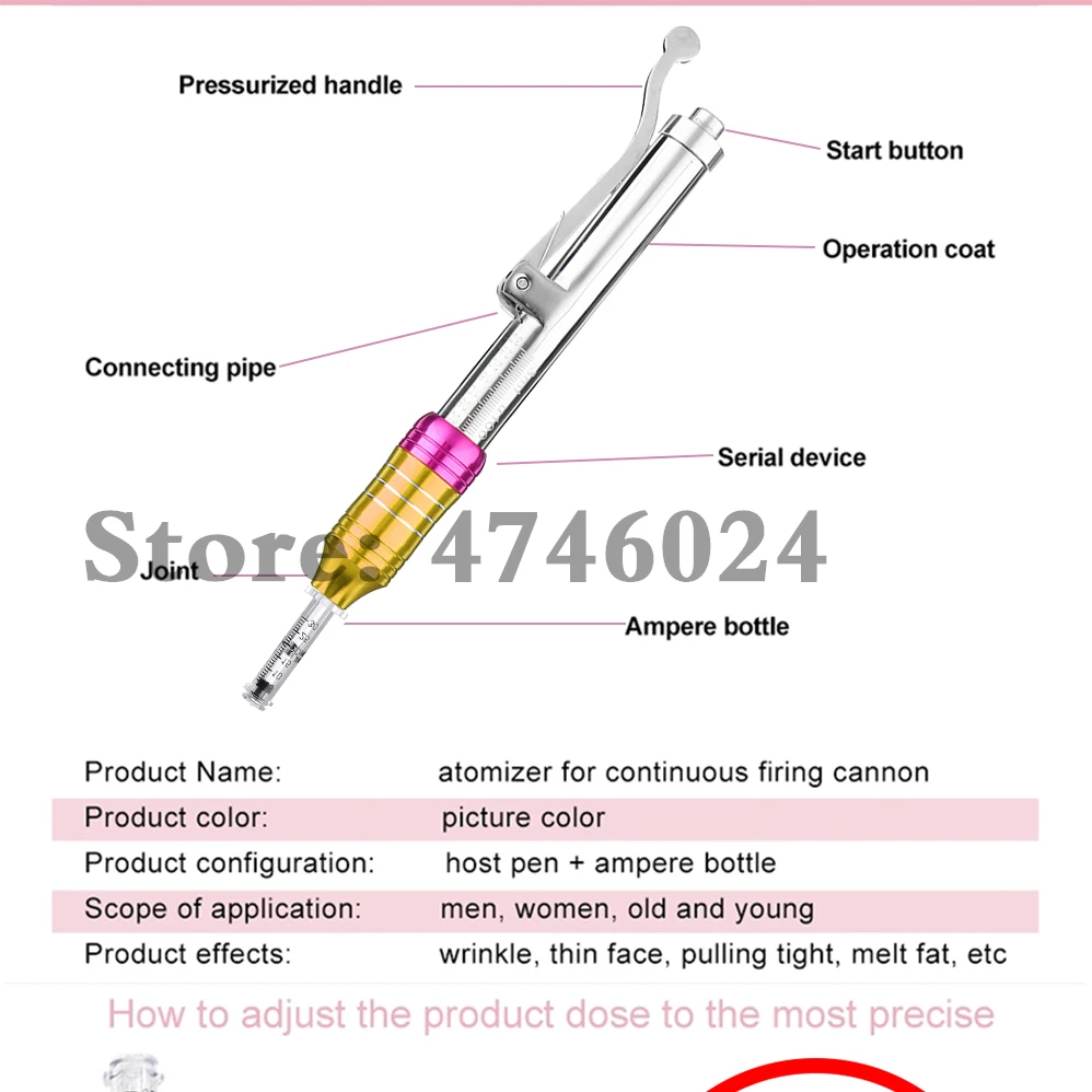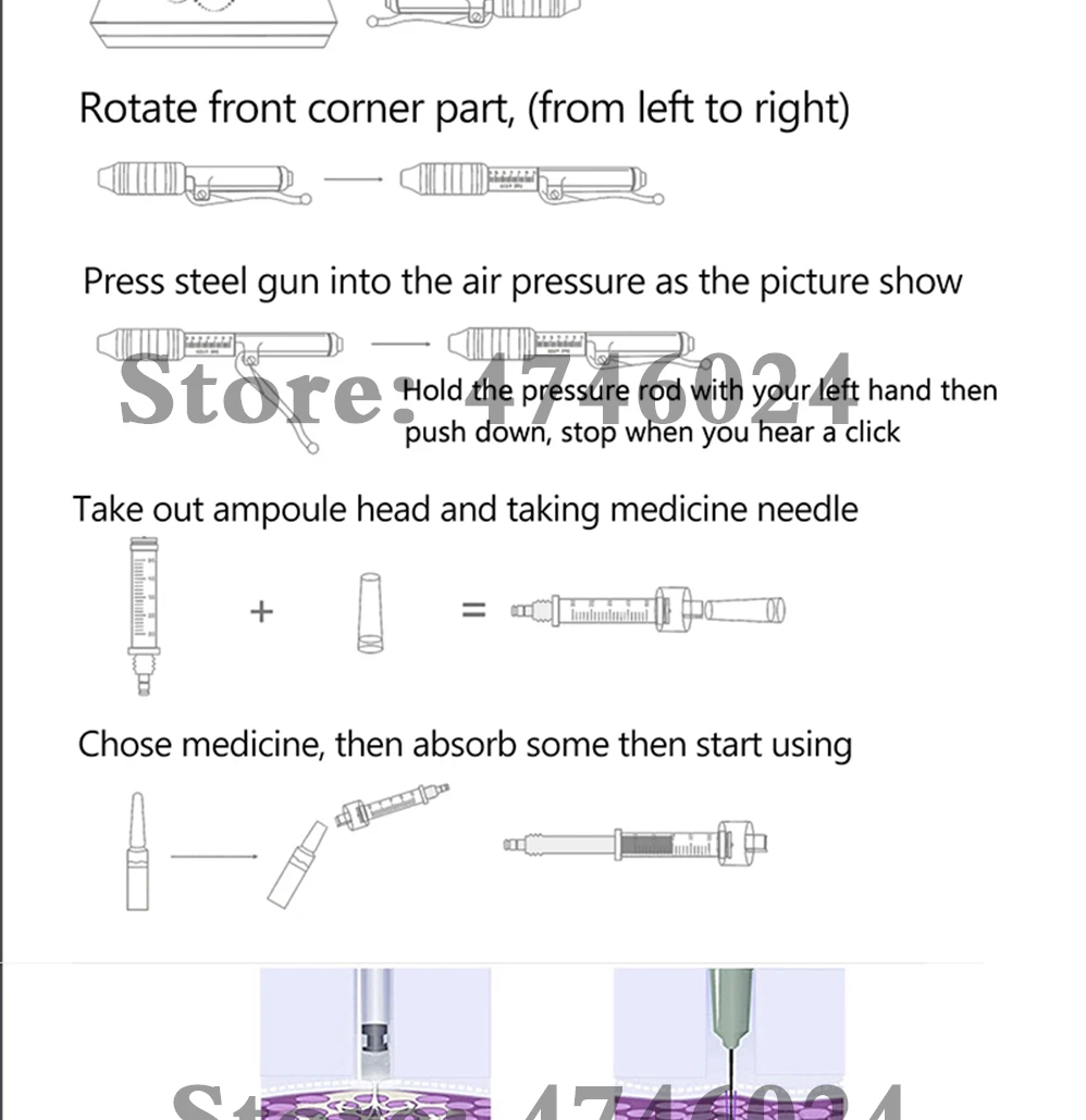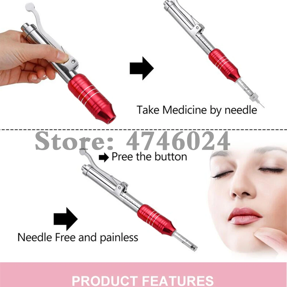 Описание продукта: Тип: ручка с гиалуроновой кислотой Особенности: удаление кровеносных сосудов, омоложение кожи, темные круги, удаление морщин, потеря веса, увлажняющий крем, отбеливание, увлажняющий крем Сертификация: медицинская CE / ISO13485 / RoHS Материал: 316 нержавеющая сталь (Профессиональная Медицинская нержавеющая сталь) Объем впрыска: 0,01 мл ~ 0,12 мл (Минимальная шкала 1 кадра составляет 0,01 мл, если вы хотите играть 0,05, то вниз 5 кадров, максимум 12 кадров составляет 0,12 мл, самая большая шкала-0,3 мл) Режим работы: распыление высокого давления/мульти-съемка Глубина впрыска: 3-4 мм Принцип работы: Пружина и поршень, которые позволяют под давлением быстро и равномерно вводить препараты под кожу через отверстие диаметром 0,1 мм, что в два раза меньше толщины иглы для инъекций! С помощью энергии механического действия пружина и специальный поршень в аппарате позволяют под давлением быстро, но аккуратно проталкивать поток лекарств через Микроскопическое отверстие в подкожной ткани. Препараты усваиваются гораздо лучше и быстрее, чем с введением иглы, что было подтверждено в серии исследований и тестов, проводящихся в разных странах мира. Идеальное решение для тех, кто подвержен рубцам и подкожным сгусткам. Преимущества: * Не вызывает болезненных ощущений впрыска топлива * Инъекция без иглы устраняет риск инфекции от иглы * Не оставляет шрамов и проколов на ткани кожи с помощью иглы * Лучшее и быстрое поглощение лекарств * Строго Подкожная инъекция-устраняет риск проникновения препарата в мышцу * Быстро, легко и безопасно * Раздельное и экономичное дозирование препарата