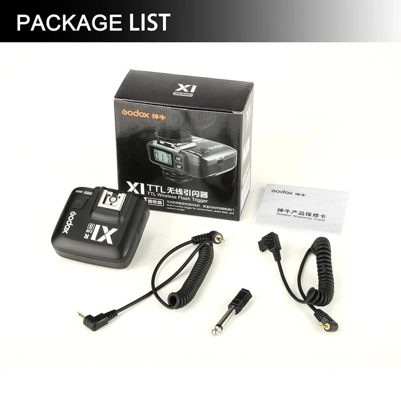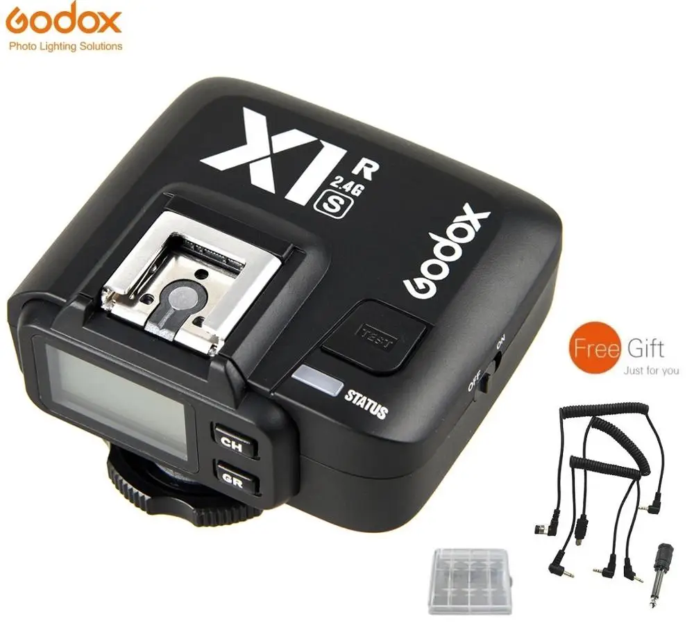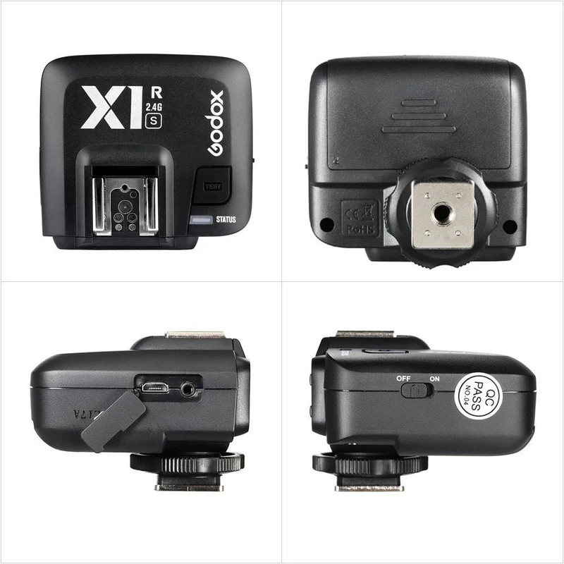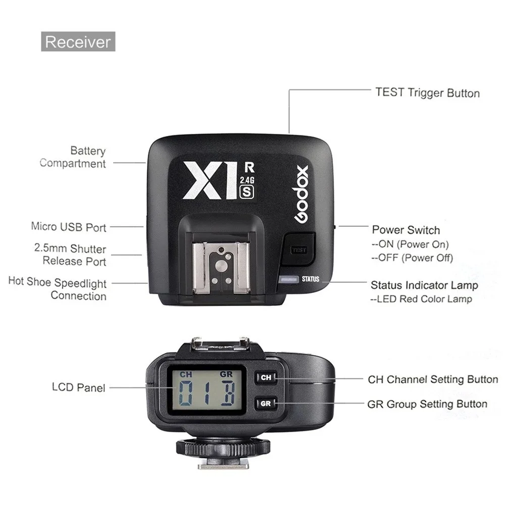 Совместим с передатчиком Godox X1T-S. Поддержка GR group flash, max.5 групп и 32 каналов. 2,4G Беспроводная передача, рабочее расстояние может достигать до 100 метров. Может использоваться в качестве спуска затвора. ЖК-экран для удобной работы.