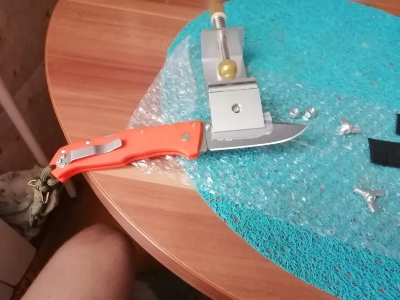 Быстрая доставка по России. Полностью соответствует описанию. Выглядит как на фото. Комплектация: в пластиковом пакете присутствует удерживающее нож приспособление, два болта- барашка, две гайки к ним, один болт под шестигранник и гайка к нему для сжатия губок, шестигранник и два кусочка кожи. Ширина удерживающих губок немного меньше родного зажима точилки. В целом все добротно, рекомендую.