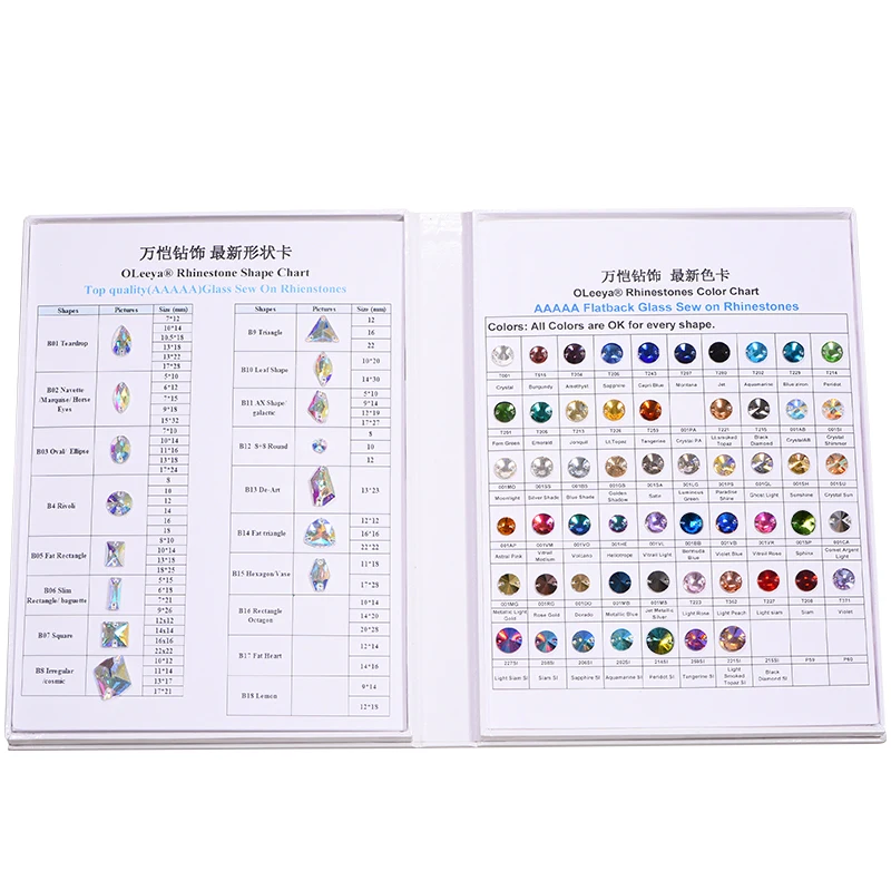 Высокое качество AAAAA стекло пришить Стразы Цвет и форма диаграмма