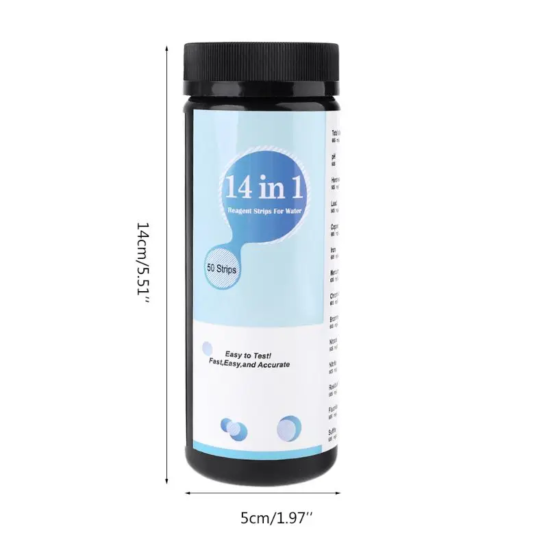 Описание:14 в 1 тест-полоски, которые могут проверить полную Щелочность, PH, твердость воды, свинец, медь, железо, ртуть, хром/Cr(VI) бром, нитрат, нитрит, Reaidual chorine, фторид и сульфит.Используется для питьевой воды, домашнего смесителя, колодезной воды, бассейнов и более высокого качества воды.Прост в эксплуатации и может быстро получить результат.Просто окуните и сравните с большой цветовой таблицей на бутылке.Это полезно для нашей заботы о здоровье, которая защитит нас от загрязненной воды.Может использоваться в бассейнах, горячих источниках, рыбоводстве, питьевой воде, тестовых полосахКак использовать:Шаг 1: Удалите тест-полосу, не прикасайтесь к полям реакции.Шаг 2: Немедленно закройте контейнер снова.Шаг 3: окуните тест-полосу примерно на 1-2 секунды в образец пресной воды.Шаг 4: прочитайте результат, сравнив цветовую шкалу через 60 секунд.Условия хранения: 2-30 Цельсия (сухое место без светильник)