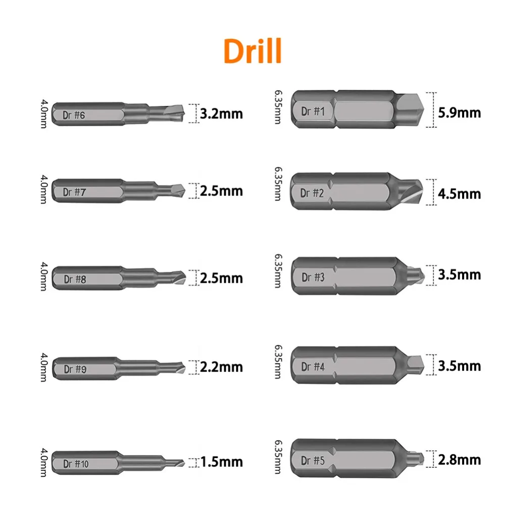 2. Используйте сверло (Dr) для сверления отверстия в сломанных винтах