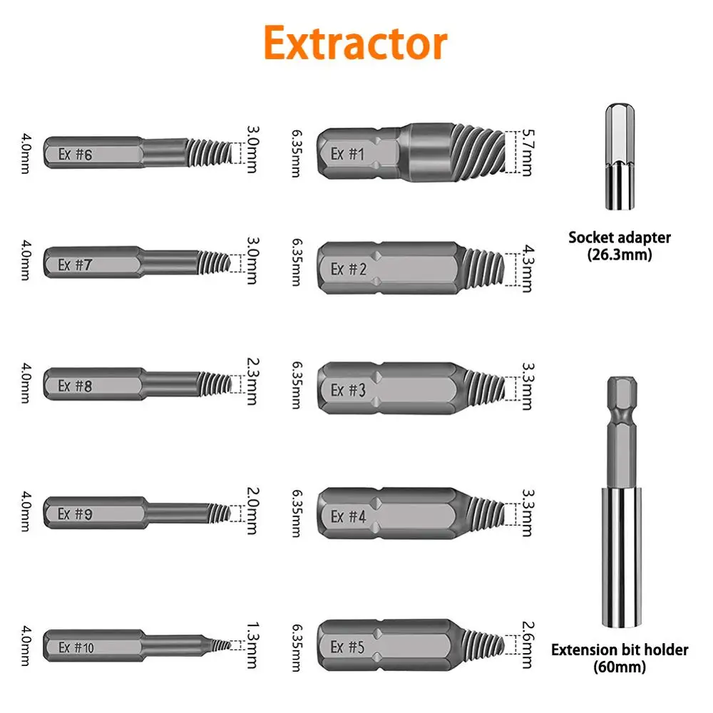 3. Комплект экстрактора с зачищенными винтами включает в себя 20 штук экстрактора с зачищенными винтами в 10 различных размерах, чтобы удовлетворить все ваши требования. Подходит для винтов любого размера или bol