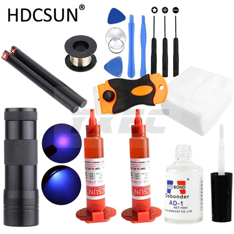 LOCA УФ Клей 5 мл + 9Светодиодный УФ-светильник + Очиститель клея UV 20 г + режущая проволока 50 м + одежда для Ремонт сенсорного ЖК-экрана