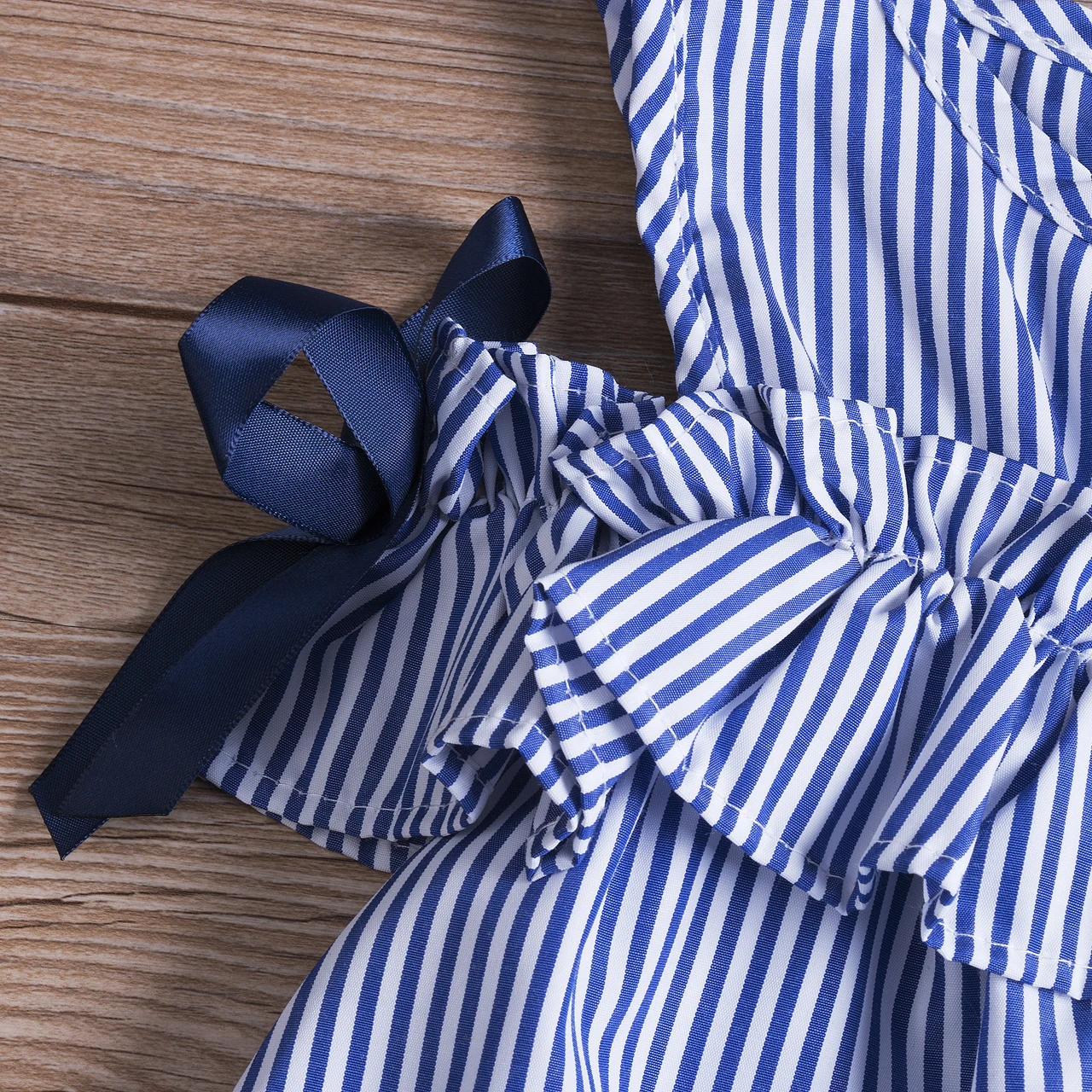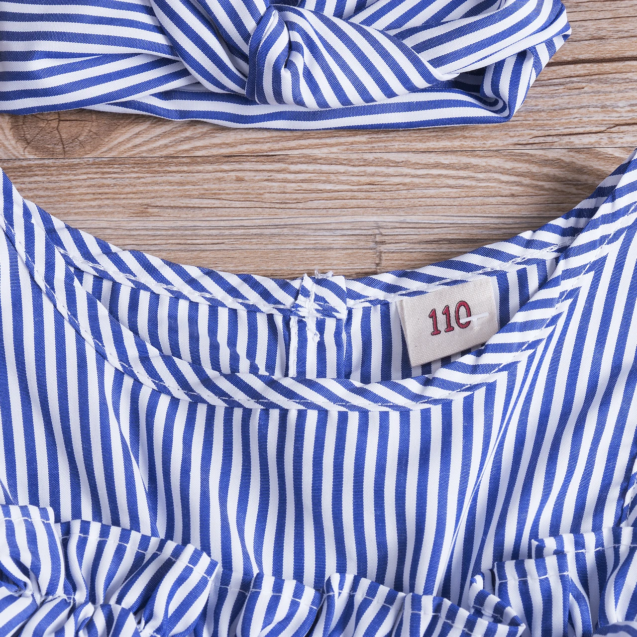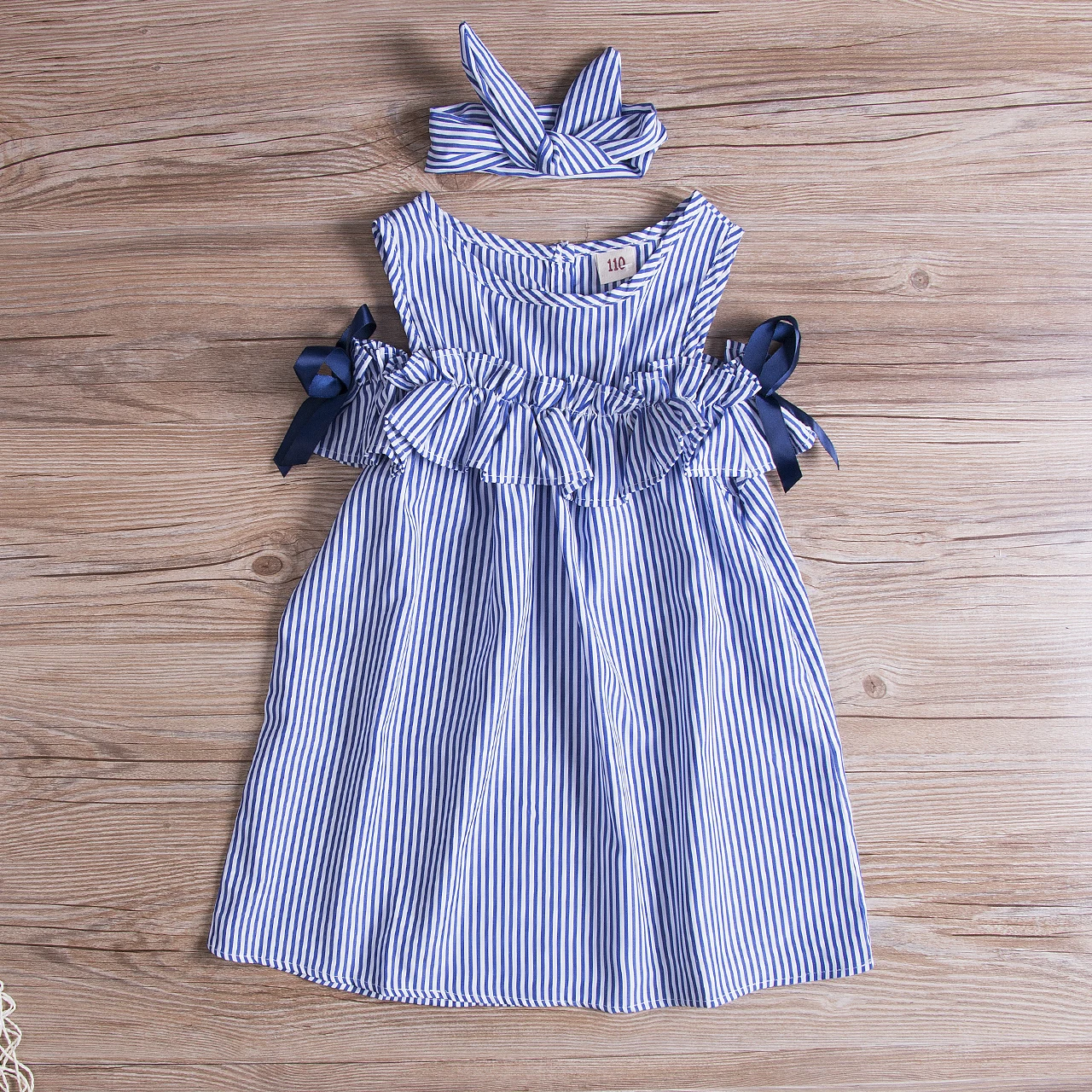 Платье детское летнее в синюю полоску, с открытыми плечами и оборками