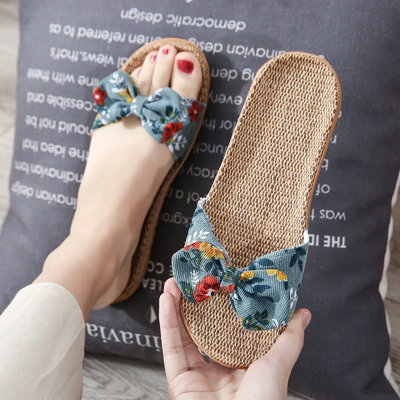 Suihyungженские тапочки; Новинка 2021 года; Летние женские повседневные шлепанцы с цветочным узором и бантом; Плоские сандалии женские домашние тапочки льняные шлепанцы