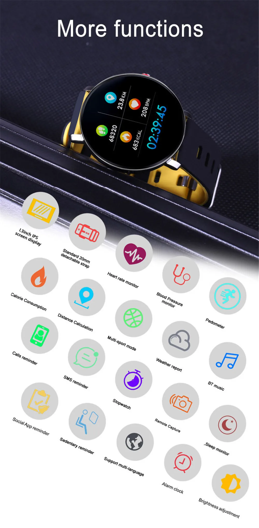 Таймер, шагомер, расход калорий, расчет расстояния, частота сердечных сокращений, кровяное давление, кислород, монитор сна (время сна, качество сна), отображение включения и выключения, погода, пробуждение экрана/датчик, секундомер