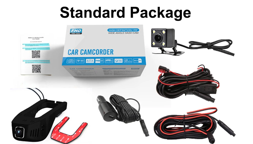 Упаковочный лист1 шт. * Автомобильный видеорегистратор1 шт. * Автомобильное зарядное устройство1 шт. * Задняя камераНаклейка 1 шт. * 3 м1 шт. * Руководство пользователя2 шт. * кабель