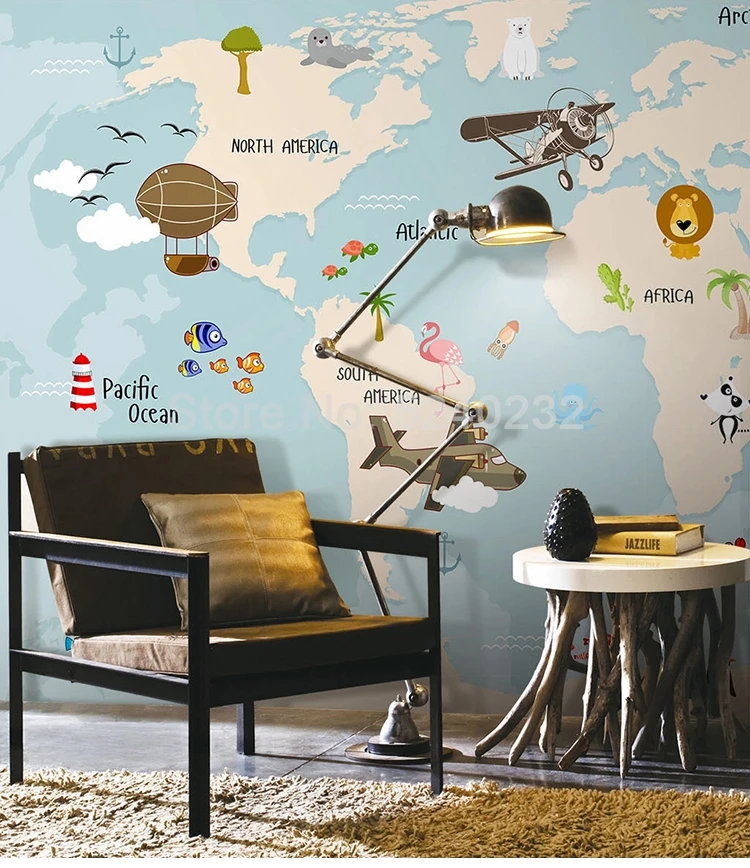 Рисованные вручную карты мира, мультфильм животных, парусник, самолет, 3D фото обои для детской комнаты, спальни, Настенный декор, изображение