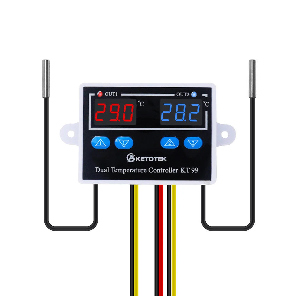 Технические характеристикиНезависимый двухполосный контроллер температуры.Контроль нагрева или охлажденияВсе параметры настройки могут быть сохранены после короткого замыкания.Прямая выходная мощность.Используется для бытовой морозильной камеры, резервуара для воды, холодильника, промышленного охладителя, парохода, промышленного оборудования и другой системы контроля температуры.ОсобенностиИсточник питания: 12VDC, 24VDC, 110V-220VAC (пожалуйста, выберите тот, который вам нужен)Диапазон управления: -50 ~ 120 °CРазрешение: 0,1 °C(-9,9-99,9); 1 °C (другой диапазон)Точность: ± 0,1 °CЧастота обновления: 0.5SДатчик 1 2: NTC10K водонепроницаемый датчик каждыйВыход 1 2: Макс 10A непосредственно выход каждыйРабочая температура: -10-60 °C, влажность 20% -85% RHРазмер: 100 мм (Д) * 55 мм (Ш) * 32 мм (глубина)Размер резки: 75 (Д) мм * 55 (Ш) мм M3 винтовое отверстиеПотребляемая мощность: Статический ток: ≤ 35 мА, притягивающий ток: ≤ 65 мА