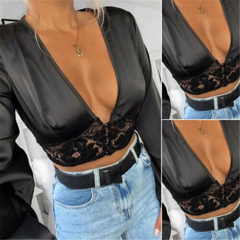 Женская атласная блузка, Приталенный топ с глубоким V-образным вырезом, элегантная повседневная однотонная блузка, лето 2020