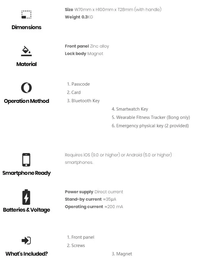Посылка включает в себя: 1 * Клавиатура 1 * Проводное подключение 1 * Руководство пользователя. Параметры: 1. Методы разблокировки A. Bluetooth ekey B. Пароль C. Микросхемой чипом микропроцессорные карты 2. Два программного обеспечения управления блокировкой Один для персонального использования Другой для квартиры, квартиры, отеля, пользователей Airbnb 3. Версия Android, версия Apple(IOS), веб-версия трех версий программного обеспечения управления 4. Одно умное приложение может управлять всеми замками во всей области, такими как весь дом, все офисное здание или вся школа, вся квартира 5. Одно умное приложение может управлять всеми замками в различных свойствах, таких как отель, квартира или airbnb, расположенных в разных местах 6. Бесплатный SDK и API 7. Удаленное изменение пароля через Интернет 8. Когда пользователь откроет дверь, он получит сообщение в режиме реального времени 9. Для пользователей, не имеющих смартфонов, они могут разблокировать дверь с помощью пароля 10. Может устанавливать ограниченные по времени пароли и ekeys 11. Вы можете отрегулировать левое и правое Направление ручки двери самостоятельно. 12. Wifi и мобильный Интернет-пульт дистанционного управления 13. Это умное приложение может использоваться в качестве рабочего времени 14. Время работы в режиме ожидания составляет до 12 месяцев, когда батарея начнет работать, система будет иметь звук и светильник 15. Удаленно просматривайте состояние двери, открывайте или закрывайте 16. AES 128-bit шифрования не допускать никаких хакер скрытые опасности