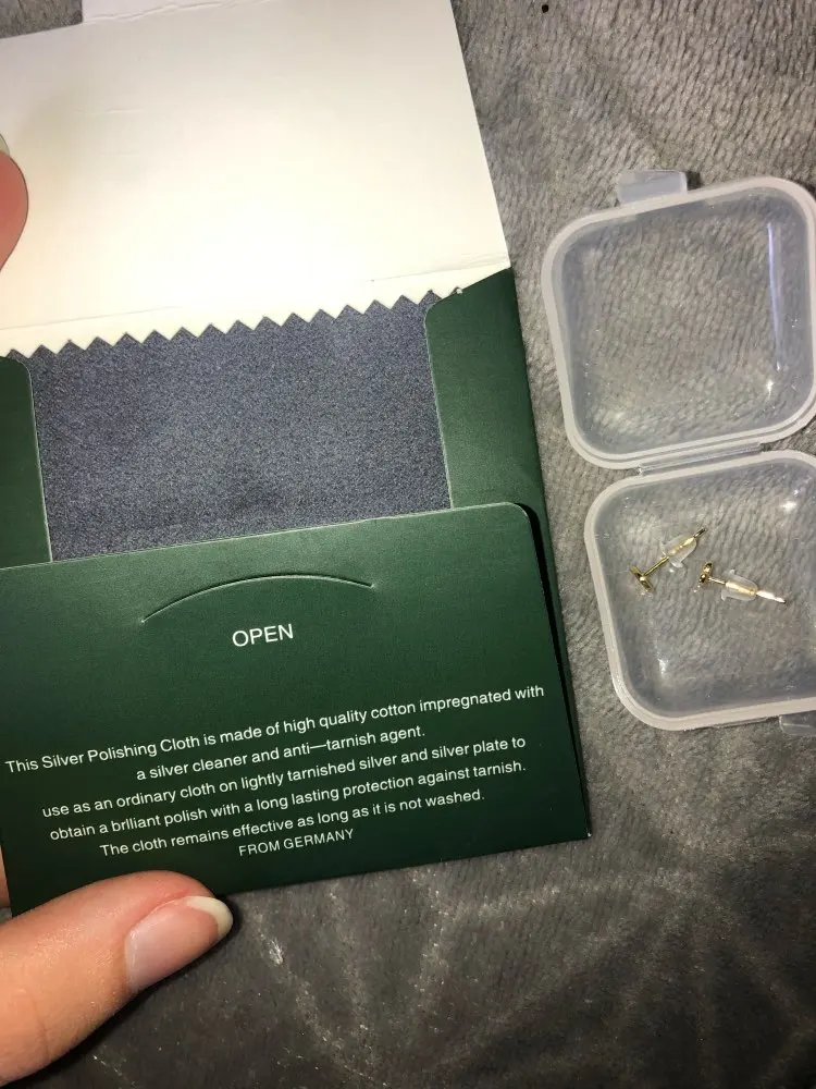 Я только что получил здесь, они поставляются с двумя силиконовыми гайками, и обычные очень милые, я их люблю. Они поставляются в плотной сумке и внутри маленькой коробки, очень идеальной. У меня также была мочалка, чтобы очистить серебро так здорово. Большое вам спасибо