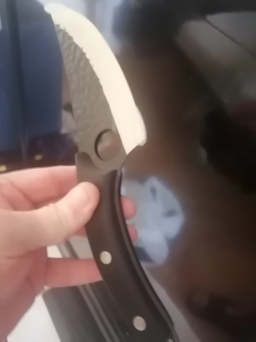 все как на фото, в руке лежит удобно, отверстие под палец фиксирует направление реза, сталь будем посмотреть, но угол заточки правильный, пока все устраивает