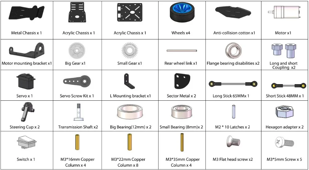 Сервопривод двигателя x1 x 1 переключатель x 1 большая передача x1 (белый пластик) Малая передача x1 (белый пластик) Сектор Металл x 2 рулевого стакана x 2 заднего колеса ссылка x1 Металлическое шасси x 1 акриловое шасси x 1 акриловое шасси x 1 серво-винтовой комплект x 1 анти-столкновения хлопок x1 Монтажный кронштейн двигателя x1 фланец подшипника инвалидности длинная и короткая муфта x2 L Монтажный кронштейн x1 длинная палка 65 мм x 1 Короткая палка 48 мм X 1 вал коробки передач x2 большой подшипник (12 мм) x 2 маленьких подшипника (8 мм) x 2 шестигранных адаптера x 2 колеса x4 (цвет для Ramdon) m2 * 10 защелки x 2 M3 * 5 мм Винт x 5 M3 винт с плоской головкой x2 M3 * 16 мм медная колонна x 4 M3 * 22 мм медная колонна x 8 M3 * 35 мм медная колонна x 4