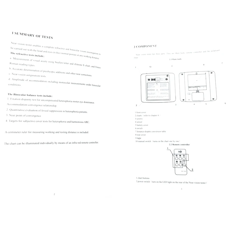 NV-100 тестер близкого видения позволяет проводить полное исследование рефракции и Бинокулярного зрения с головой и глазами в их нормальной осанке на любом рабочем расстоянии. Преломляющие тесты включают: 1. Измерение остроты зрения с помощью буквы Snallen и неграмотной электронной таблицы, а также римских типов чтения. 2. Точное определение дальнозоркости и других близких исправлений. 3. Тест на астигматизм близкого видения. 4. Амплитуда жилых помещений, включая Монокулярные измерения в бинокулярных условиях. Бинокулярные тесты баланса включают: 1. Тест на диспропорции фиксации для некомпенсированного гетерофорического моторного глаза. Соотношение между сочетанием и сочетанием. 2. Количественная оценка подавления пены у пациентов с гетерофорией. 3. Близкая точка конвергенции. 4. Цели для субъективных испытаний покрытия для гетерофории и гармоничной дуги. 5. В комплект входит сантиметровая линейка для измерения рабочего и испытательного расстояния. 6. Диаграмма может быть освещена индивидуально с помощью инфракрасного пульта дистанционного управления