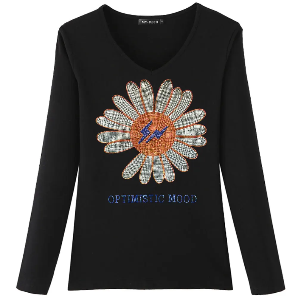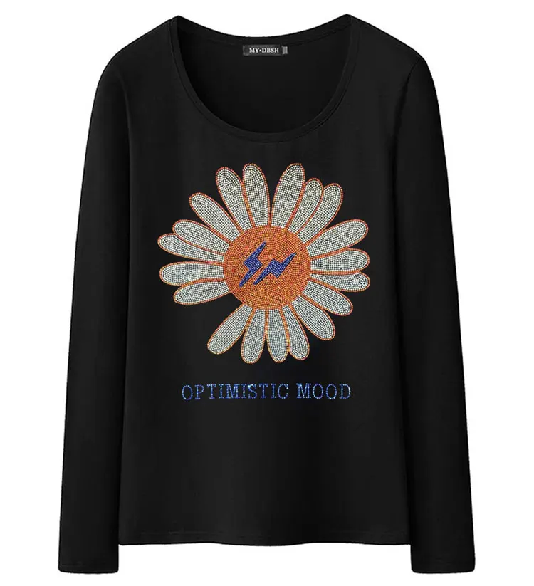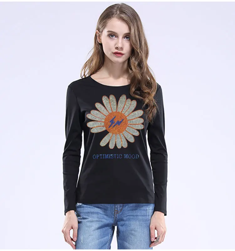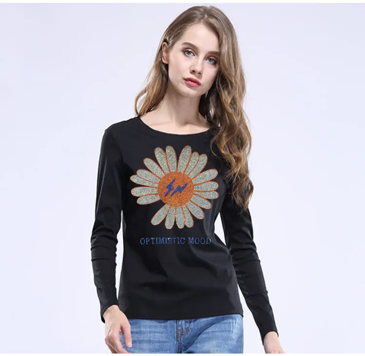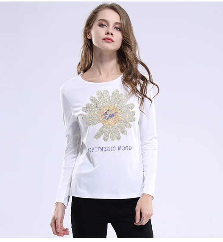 2022 милые женские футболки с подсолнухами, модные летние хлопковые топы, футболки, блестящие стразы, с длинным рукавом, для девушек, с круглым вырезом, размера плюс 5XL