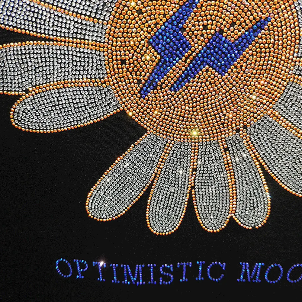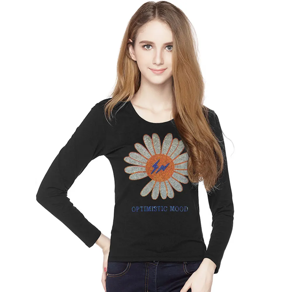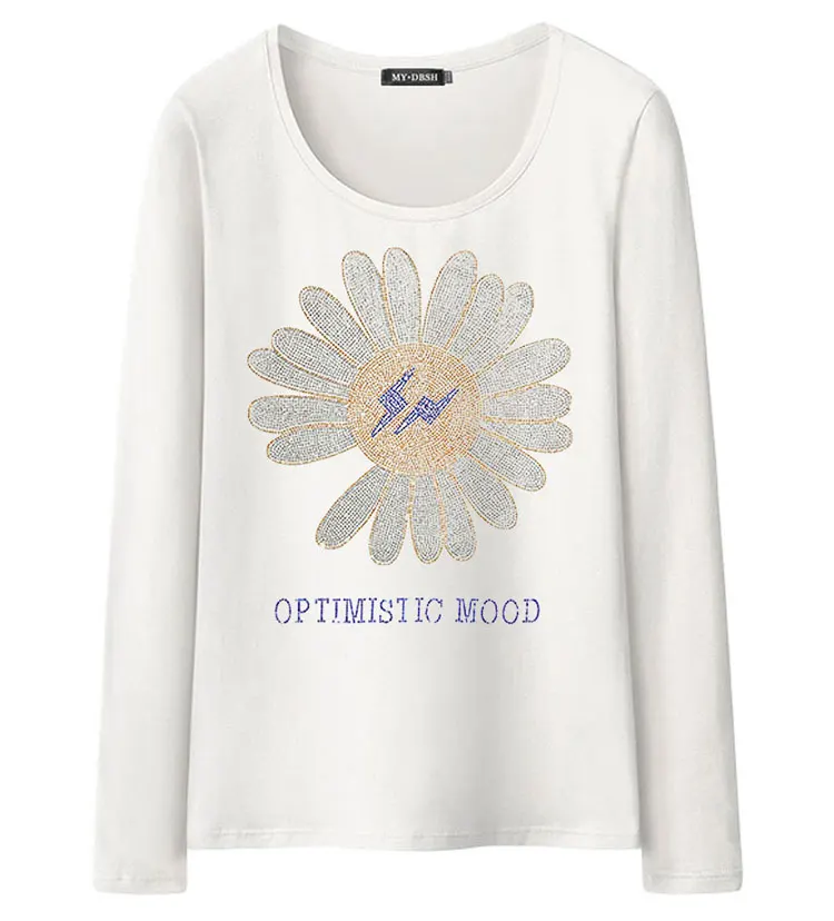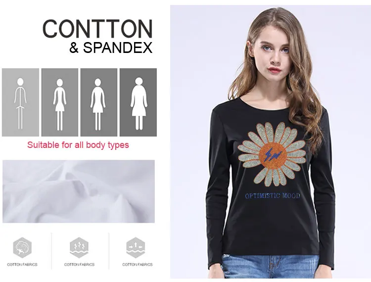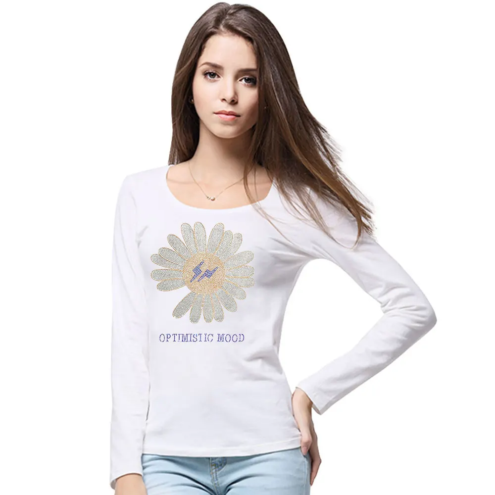 2022 милые женские футболки с подсолнухами, модные летние хлопковые топы, футболки, блестящие стразы, с длинным рукавом, для девушек, с круглым вырезом, размера плюс 5XL