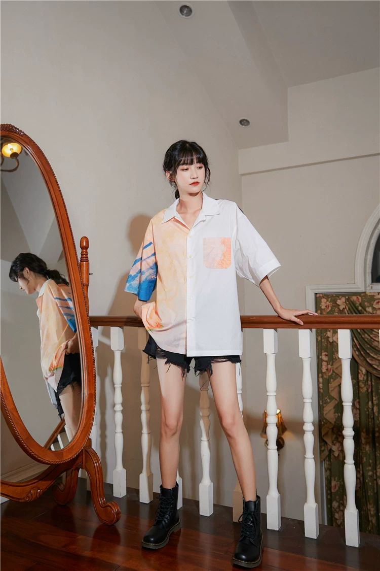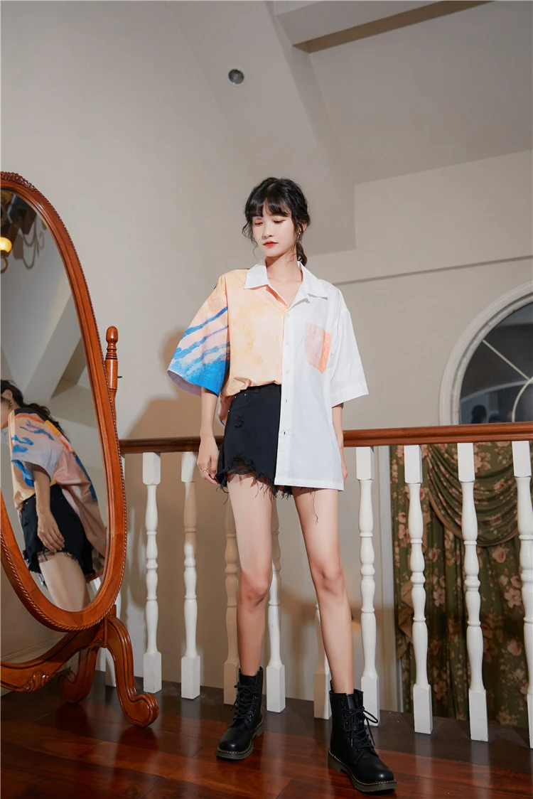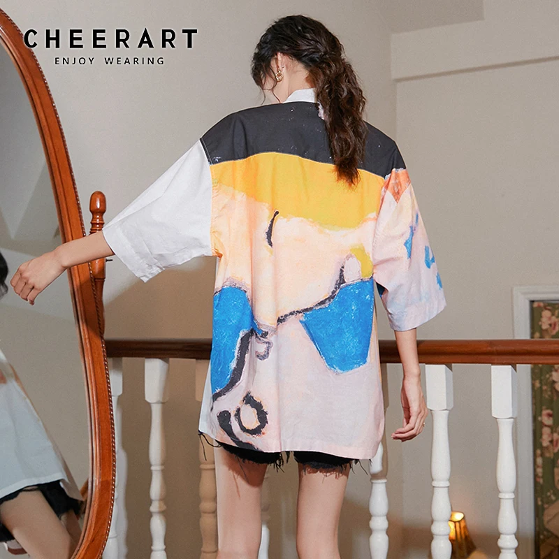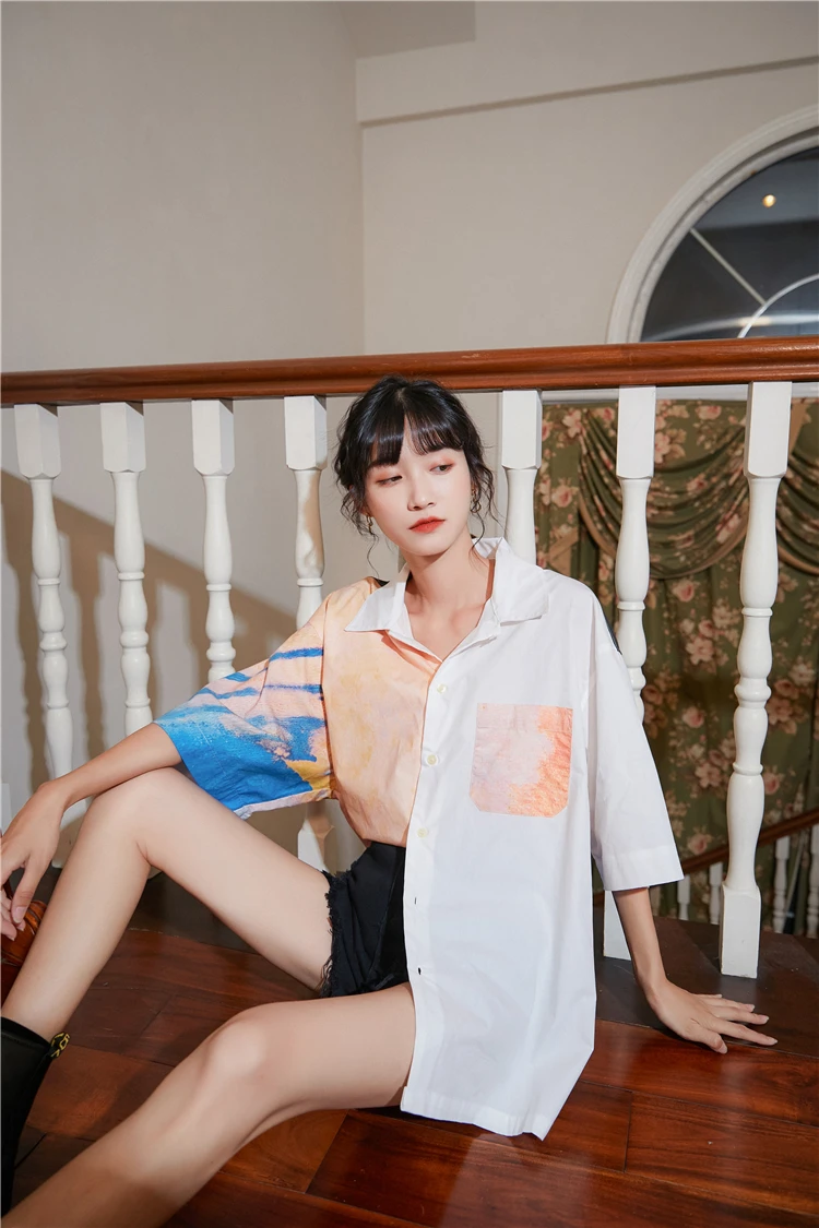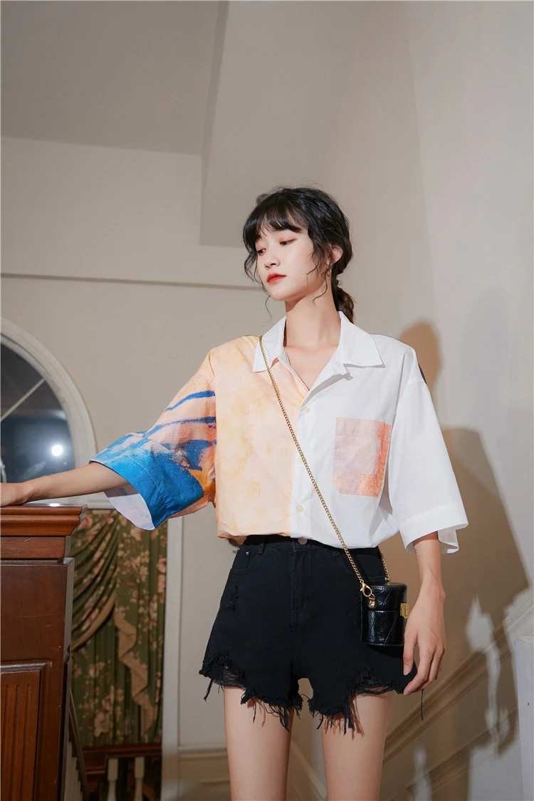 Длинная рубашка CHEERART с цветными блоками, Повседневная летняя рубашка с коротким рукавом и воротником на пуговицах, Женский Топ и блузка, белая рубашка 2020