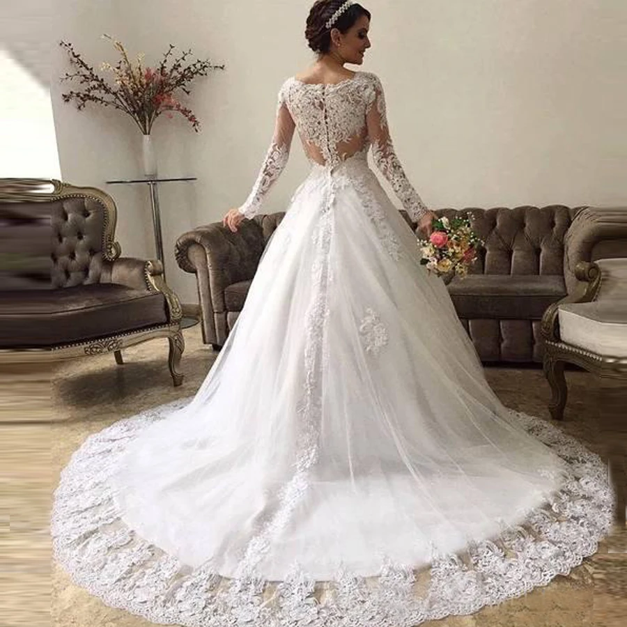 Винтажное кружевное свадебное платье А-силуэта с длинным рукавом и глубоким круглым вырезом, выполненное на заказ, robe de mariage, 2020, свадебные платья