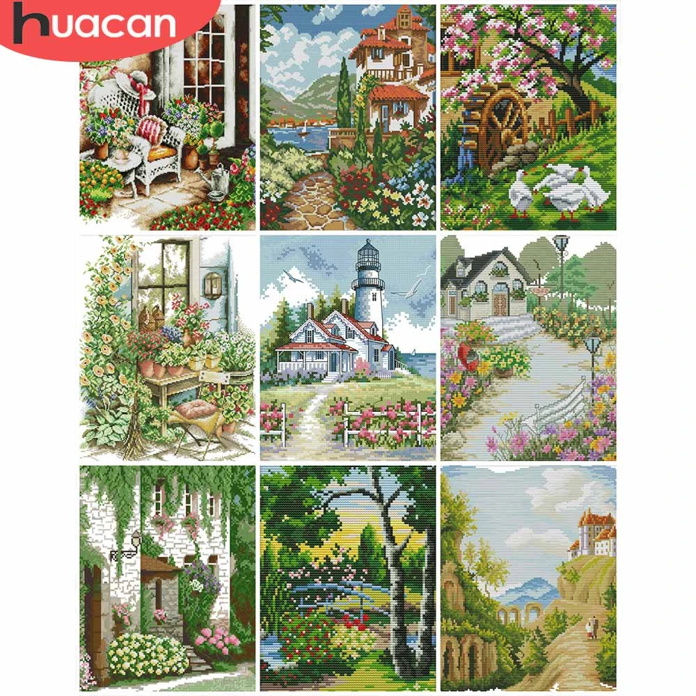 HUACAN вышивка крестиком Приморский Пейзаж Набор сделай сам цветок ...