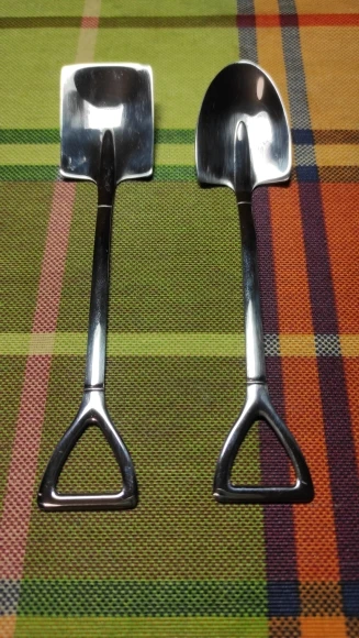 Купила у этого же продавца вторую лопату. Первая была совковая. Капает соль в солонке. Вторую заказала штыковую для сахара. Скажу вам, удобнее набирать сыпучие именно совковой. На штыковой меньше загребается. Приходится нагибать сахарницу, чтобы штыковую лопату полную набрать.