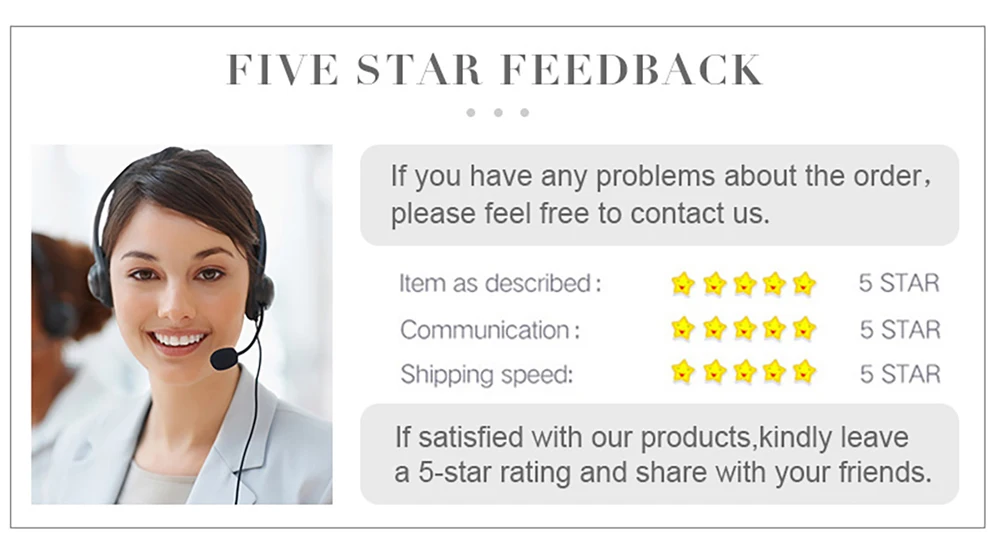 Ваши положительные комментарии являются движущей силой нашего непрерывного улучшения. Мы уважаем и доверяем каждому клиенту, чтобы предоставить вам квалифицированные продукты и услуги. Если вы удовлетворены нашей продукцией, пожалуйста, дайте нам положительный отзывы с пятью звездами. Если у вас есть какие-либо вопросы/проблемы после получения продукта, пожалуйста, свяжитесь с нами через сообщение Ali как можно скорее, и мы постараемся решить его для вас сразу, пока вы не будете удовлетворены. Оставляя отрицательный отзывы, мы не решим никаких проблем!Спасибо за вашу поддержку!