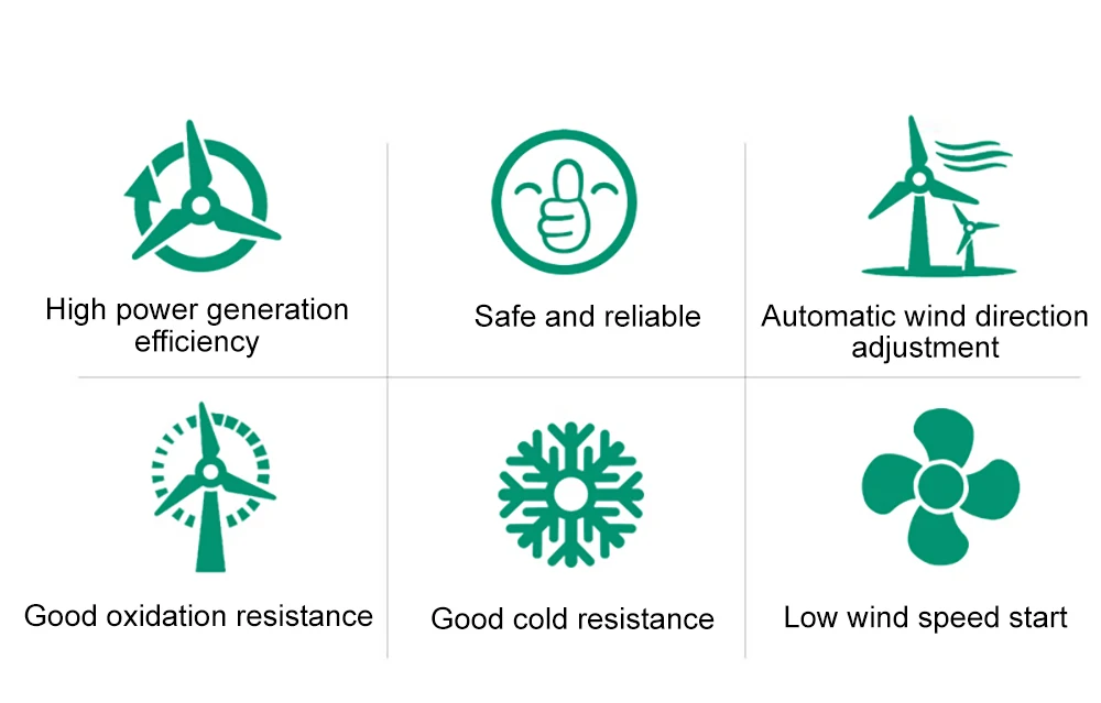1. Ветрогенератор с использованием высокомощного интеллектуального управления микропроцессором, эффективного регулирования тока и напряжения.2. Ветровая турбина запускается с низкой скоростью ветра, высокая скорость использования ветра; Малый размер, хороший внешний вид, низкая рабочая вибрация.3. Установка генератора ветряных турбин, удобная установка оборудования, техническое обслуживание и ремонт.4. Корпус ветровой турбины изготовлен из алюминиевого сплава литья под давлением, с двойной несущей, анти-Тайфун емкость более сильная, безопасная и надежная работа.5. Лопасти колеса генератора ветровой турбины изготовлены из нейлонового волокна в сочетании с оптимизацией дизайна аэродинамической формы и конструкционной конструкции, высоким коэффициентом использования энергии ветра, увеличением годового производства электроэнергии.6. Ветрогенератор с использованием запатентованного магнитного подшипника генератора, в сочетании со специальным статором, эффективно уменьшает крутящий момент сопротивления генератора, в то время как ветровое колесо и генератор имеют более хорошие соответствующие характеристики, надежность работы устройства.7. Этот ветрогенератор идеально подходит для отдыха и известен зарядкой аккумуляторов для лодок, беседок, кабин или мобильных домов, а также для зеленых ветряных мельниц, дома, корпоративные и промышленные энергетические добавки!