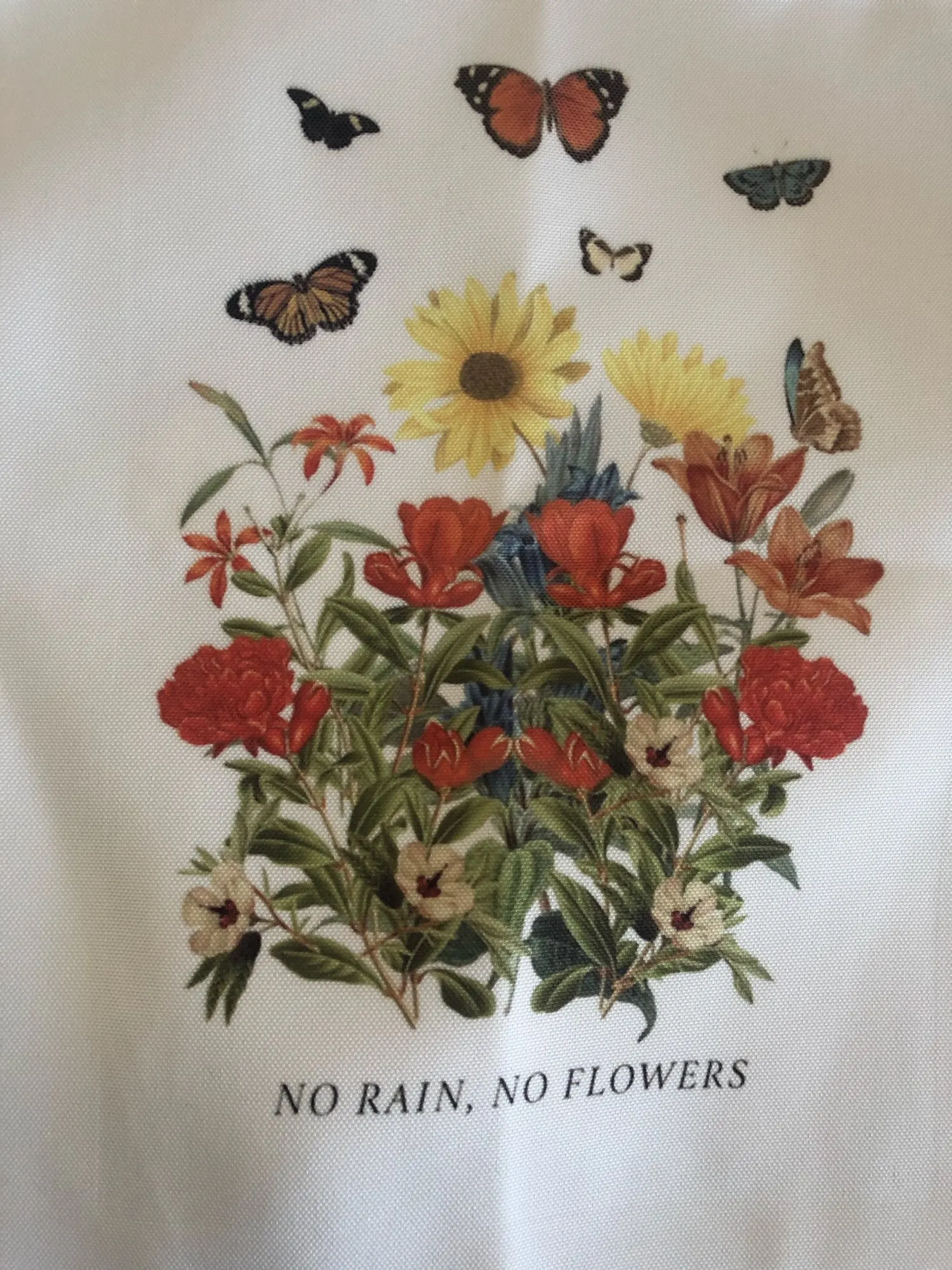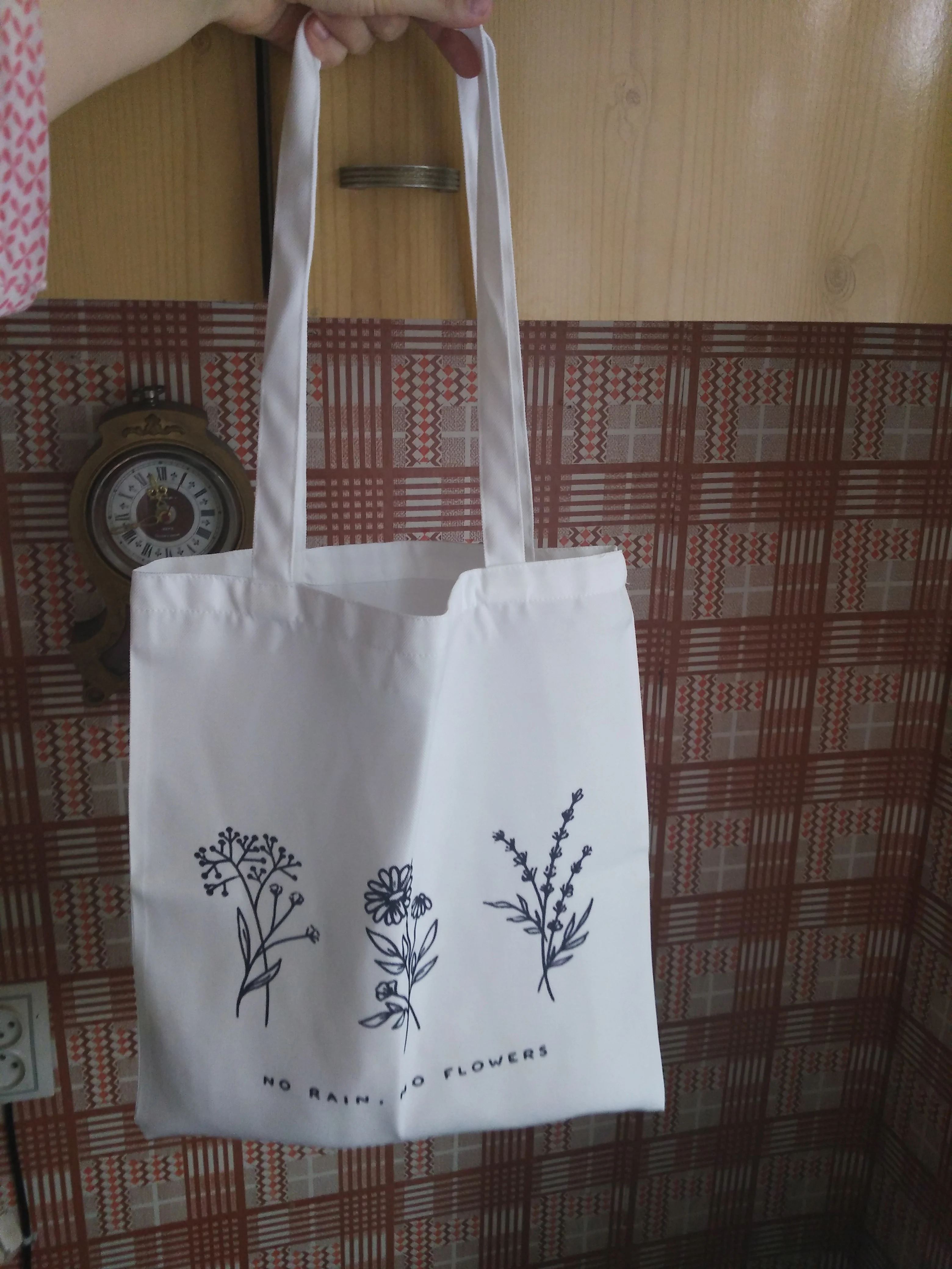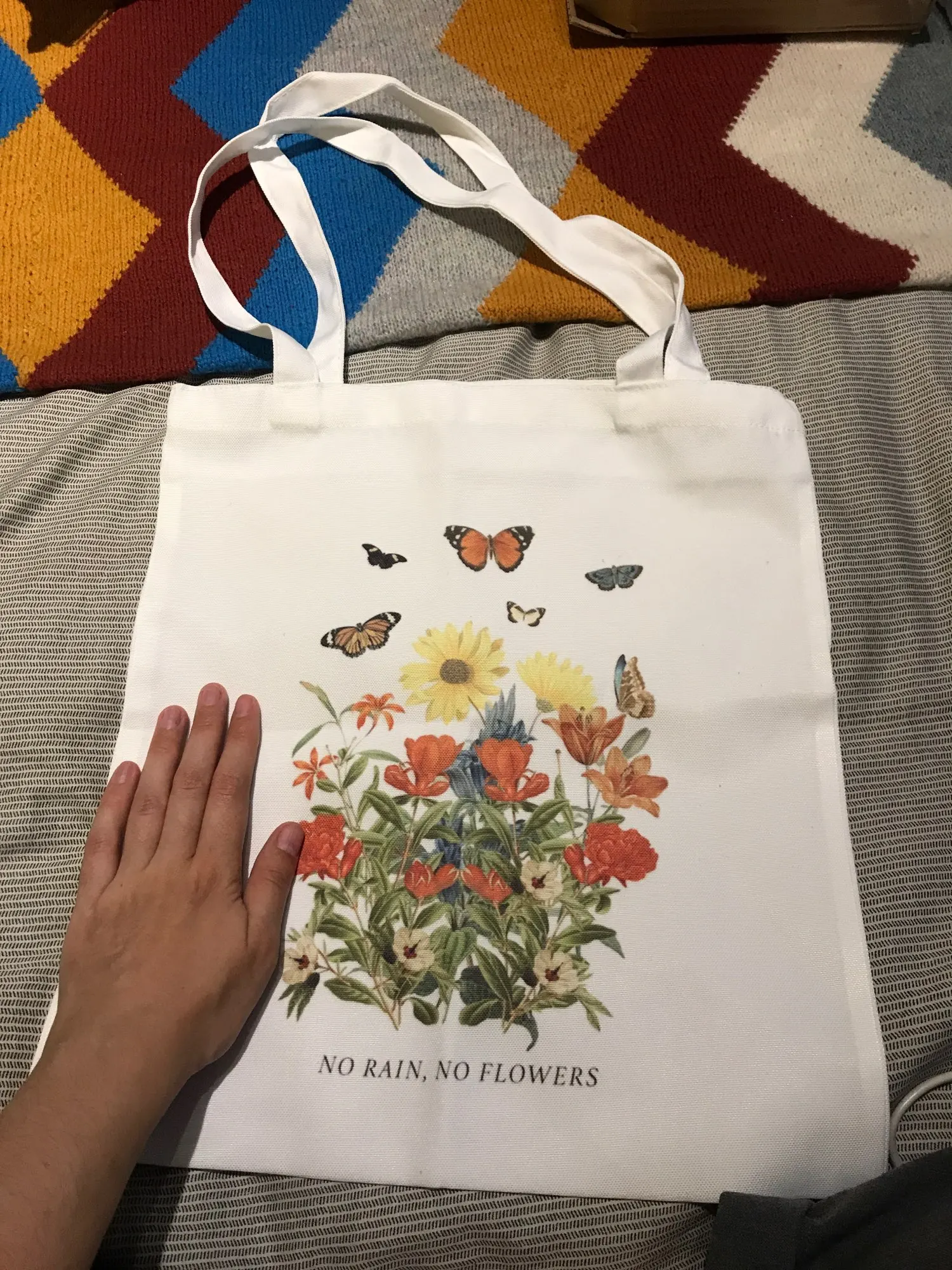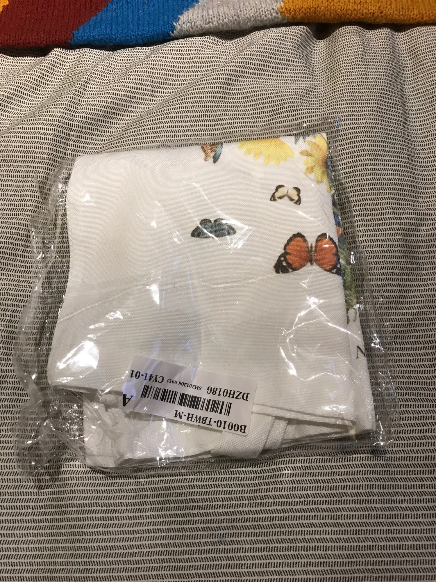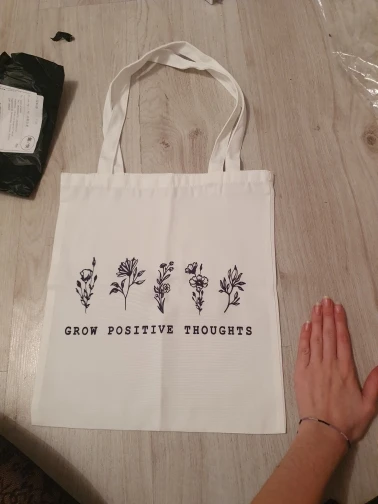 Он прибыл быстро и с точным принтом, но сумка не совсем такая ткань, которая выглядит как на фотографиях (это больше как нейлон, чем хлопок). Но очень практично и красиво!