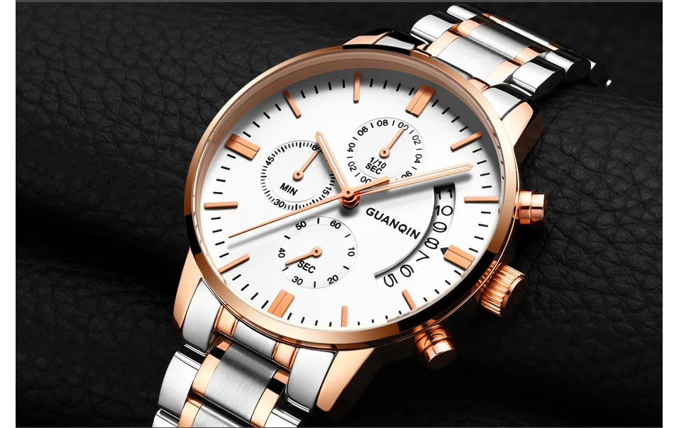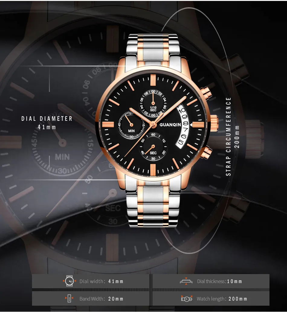 Описание-Мы используем международную философию модного дизайна, ориентируясь на производственный процесс, тщательный и долговечный. Предоставляем клиентам элегантные и доступные часы.-Новейшая революционная технология создает наш Высокоточный кварцевый механизм.-Ударопрочная и водостойкая технология продлевает срок службы часов.-Ежедневная водонепроницаемость 30 м или 50 м (не для плавания и душа).-Прочный материал, 3 года гарантии.-Заводские магазины, конкурентоспособная цена.Параметры-Бренд: GUANQIN-Особенности: Водонепроницаемость/ударопрочность-Механизм: высокоточная Автоматическая полировка высокого качества с автоподзаводом-Материал корпуса: нержавеющая сталь-Диаметр циферблата: 41 мм-Толщина циферблата: 11 мм-Ширина ремешка: 20 ммПосылка:1 часы + 1 коробка