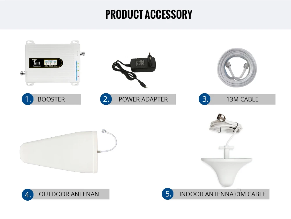 1). 1*900/1800/2100 трехполосный усилитель 2). 1 * Питание 3). 1 * Руководство пользователя на английском языке 4). 1 * наружная LPDA антенна 5). 1 * Внутренняя потолочная антенна 6). Кабель 1*13 метров